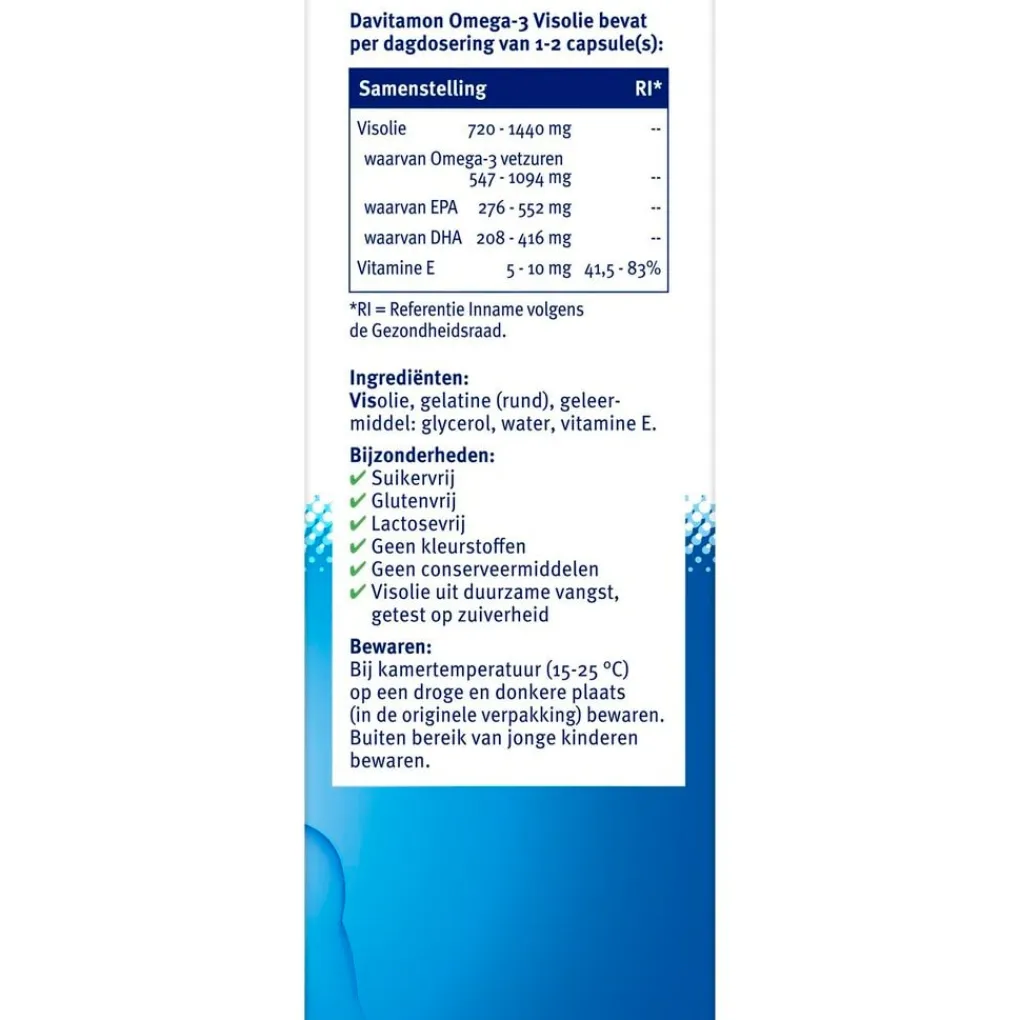 Samenstelling:# Davitamon Omega-3 Visolie bevat per dagdosering van 1-2 capsule(s):# SAMENSTELLING;%RI*#Visolie;720-1440;mg#waarvan Omega-3 vetzuren;547-1094;mg#waarvan EPA;276-552;mg#waarvan DHA;208-416;mg#Vitamine E;5-10;mg;41,5-83%#