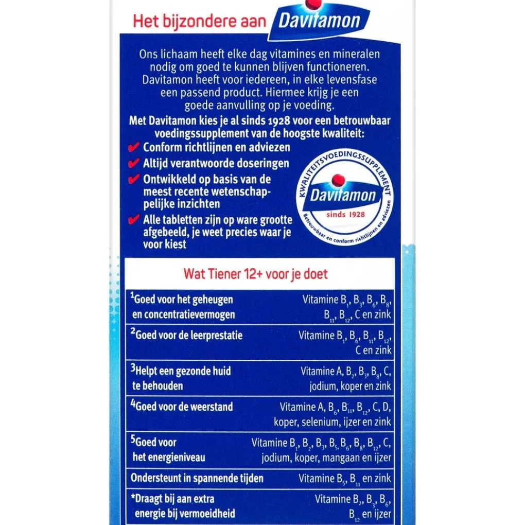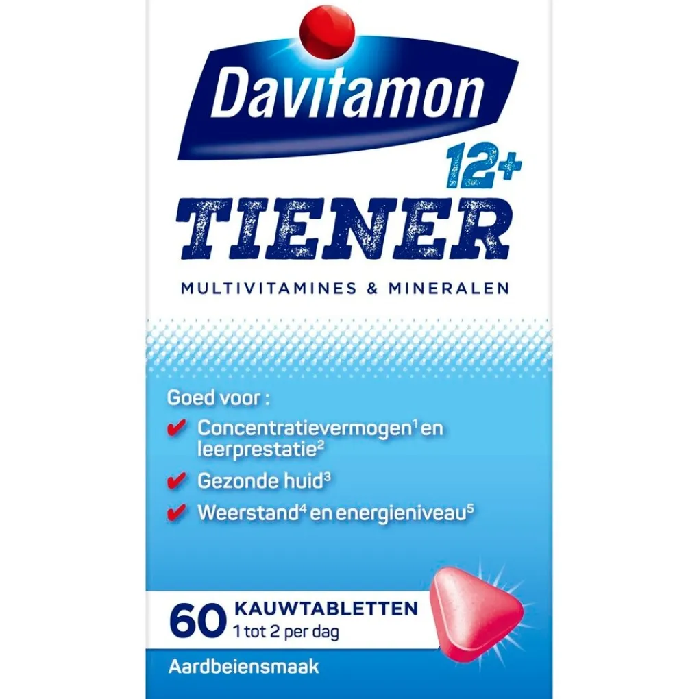 Samenstelling:#Davitamon Tiener 12+ bevat per dagdosering van 1-2 kauwtabletten:#vitamines;RI*#A;120-240;µg;15-30%#B1;0,4-0,8;mg;36-73%#B2;0,5-1;mg;36-71%#B3;5,5-11;mg;34-69%#B5;2-4;mg;33-67%#B6;0,55-1,1;mg;39-79%#B8;7,5-15;µg;15-30%#B11 (foliumzuur);112,5-225;µg;56-113%#B12;1-2;µg;40-80%#C;32,5-65;mg;41-81%#D3 (cholecalciferol);2,5-5;µg;50-100%#E;5,3-10,6;mg;44-88%#K;11,25-22,5;µg;15-30%#mineralen;RI*#calcium;60-120;mg;8-15%#chroom;10-20;µg;25-50%#jodium;37,5-75;µg;25-50%#koper;0,25-0,5;mg;25-50%#magnesium;29-58;mg;8-15%#mangaan;0,5-1;mg;25-50%#molybdeen;12,5-25;µg;25-50%#selenium;27,5-55;µg;50-100%#ijzer;6-12;mg;43-86%#zink;2,5-5;mg;25-50%#