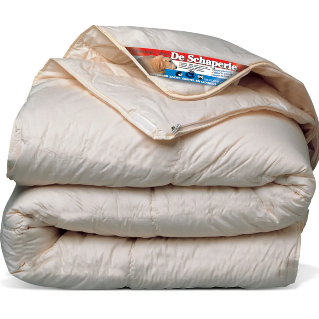 De Schaperie is een 100% zuiver scheerwollen 4-seizoenen dekbed. Puur natuurlijke wol verzorgt ’n perfect gespreide, behaaglijke warmte. Samen met het enorme absorptie en ventilatie vermogen garandeert dit een uiterst gezond en hygiënisch slaapklimaat. Bovendien bevat correct verwerkte wol ’n flinke dosis lanoline(wolvet), wat heilzaam werkt bij gevoelige en pijnlijke spieren en botten.
