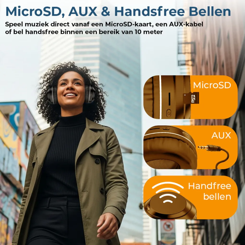 - Ingebouwde oplaadbare batterij (tot 20 uur muziek afspelen)