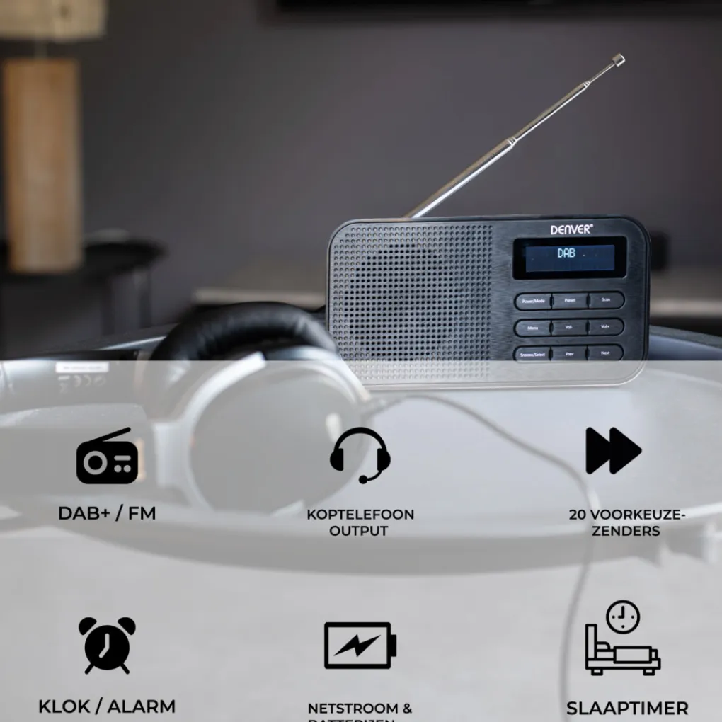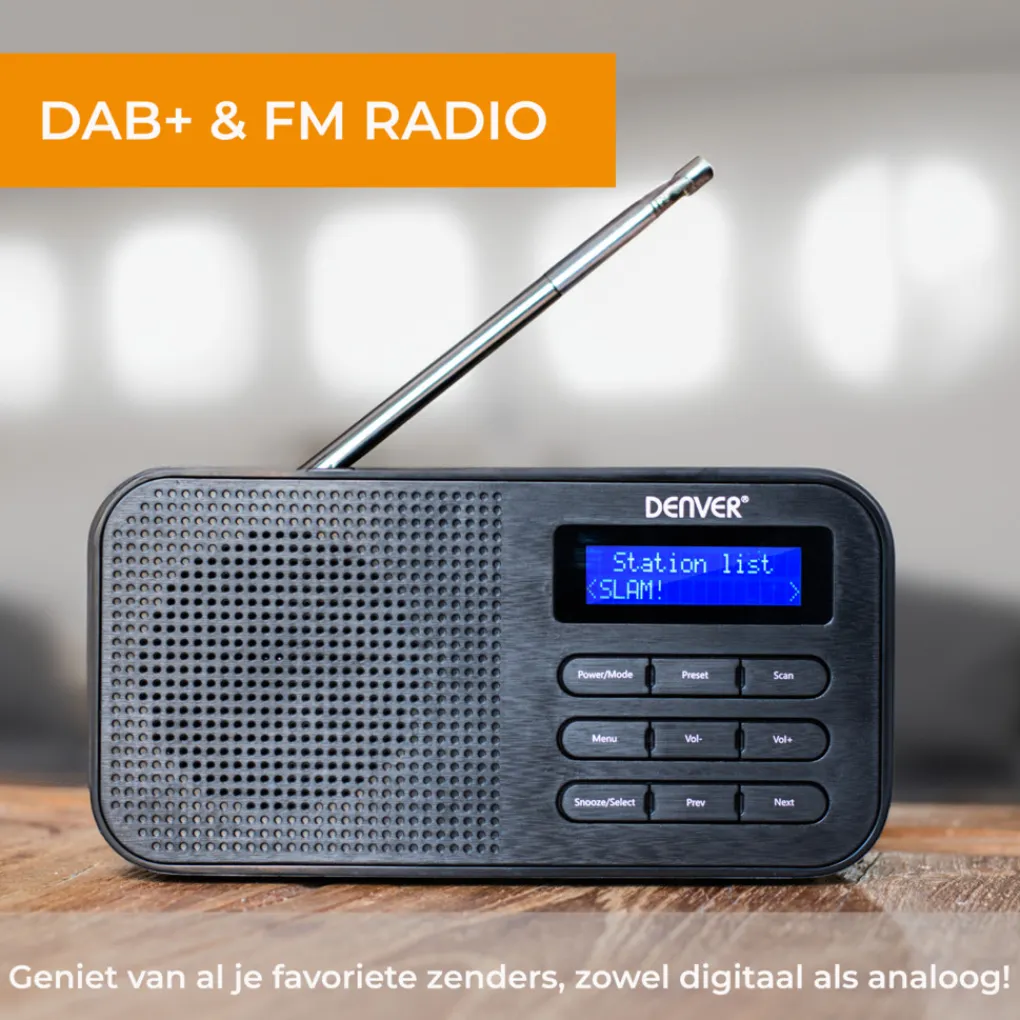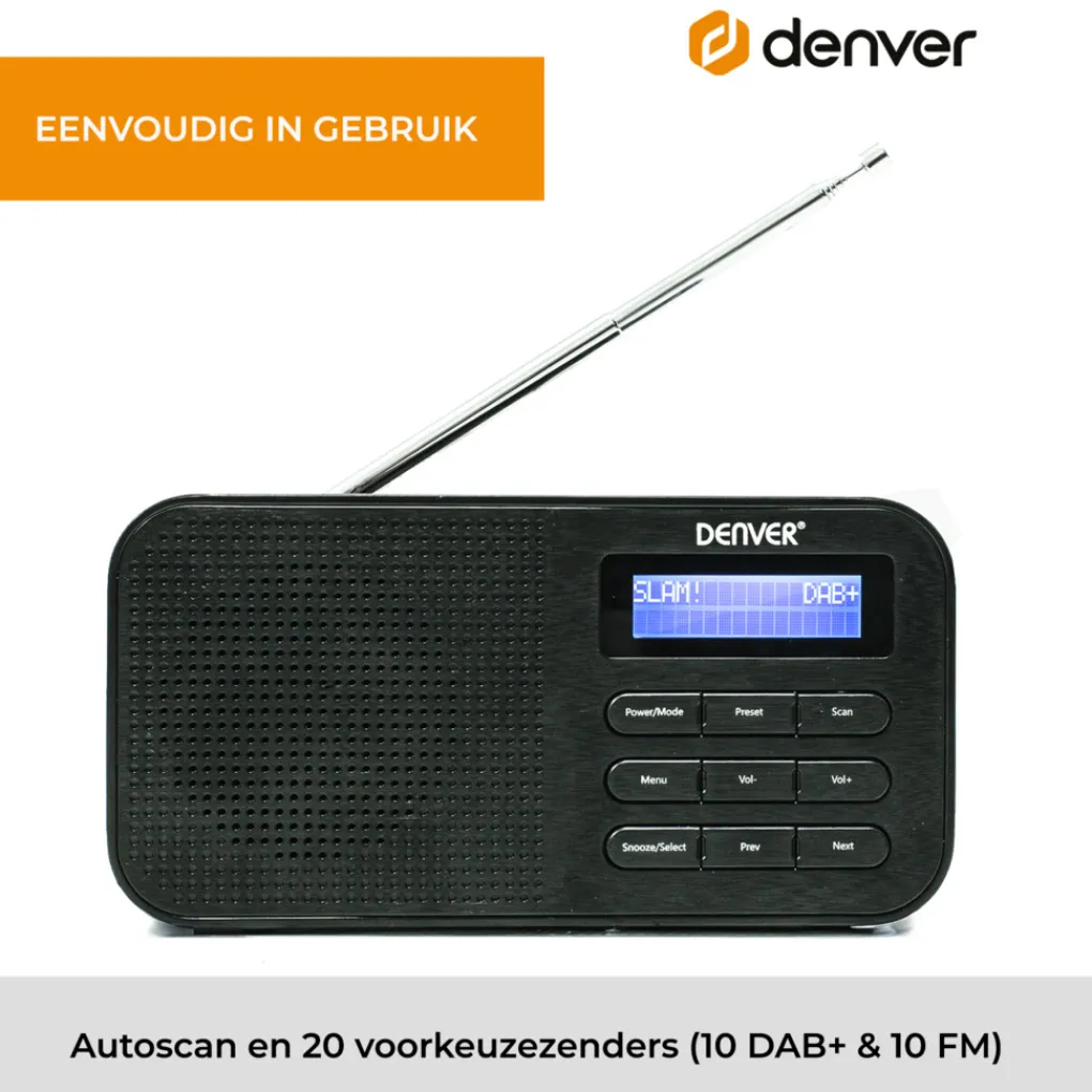 Met de DAB42 van Denver kan jij waar je maar wilt naar je favoriete DAB+ / FM radio zender luisteren! Of je nou in de keuken staat, de badkamer of lekker buiten in het park. Dankzij de DAB radio functie ontvang je signalen met een helder en zuiver geluid. De radio heeft maar liefst 20 voorkeurszenders over zijn beschikking. Zo is er genoeg keus voor iedereen! De LCD display op de voorkant geeft de naam en soort van het radioprogramma aan! Met de ingebouwde wekkerradio wordt je ’s ochtends wakker zoals jij dat wilt! Kies uit DAB+, FM óf een tradiotonele zoemer! Aan de achterkant vind je een antenne, een batterijenopslag voor batterijen en een kabelingang met AC aansluiting voor netstroom!