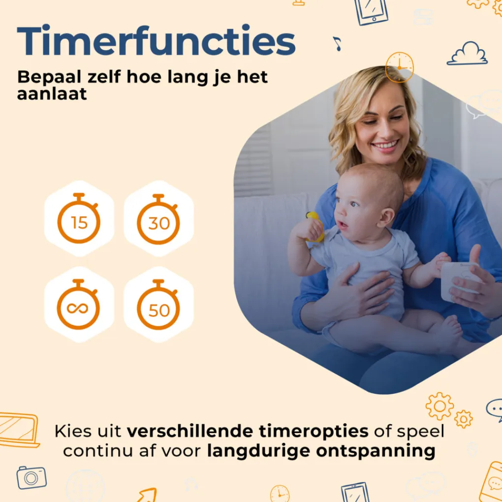 Kies zelf hoe lang het geluid blijft spelen dankzij de ingebouwde timerfunctie: 15, 30 of 50 minuten. Of schakel de continue modus in voor rustgevend geluid de hele nacht door. Jij bepaalt wat het beste werkt.