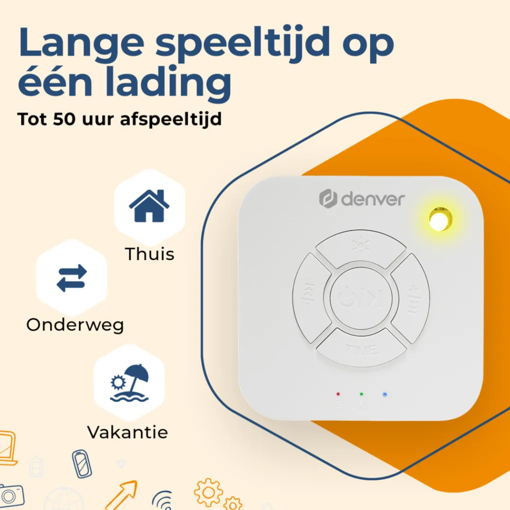Denver WN-93 White Noise Machine met ademend licht De Denver WN-93 is dé white noise machine voor een diepe, rustgevende slaap. Met 9 natuurlijke geluiden, een warm ademend nachtlampje en tot wel 50 uur speeltijd op één lading, biedt deze compacte en draadloze geluidsmachine ontspanning waar en wanneer jij dat nodig hebt. Ideaal voor baby’s, kinderen of volwassenen die beter willen slapen of zich beter willen concentreren.