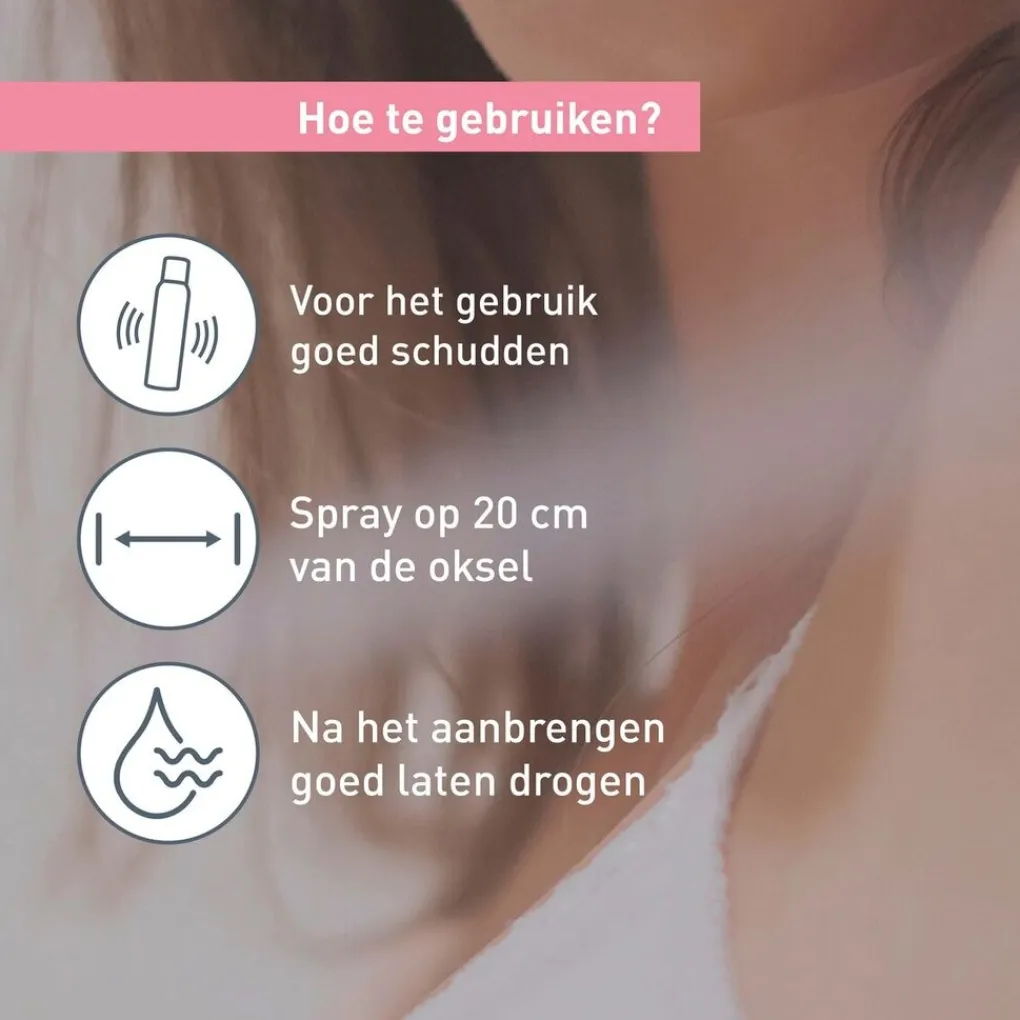GEBRUIKSADVIES: Voor het gebruik goed schudden. Spray op 20 cm van de oksel. Na het aanbrengen goed laten drogen. Bij verstopping de spuitkop onder de kraan met lauwwarm water afspoelen.