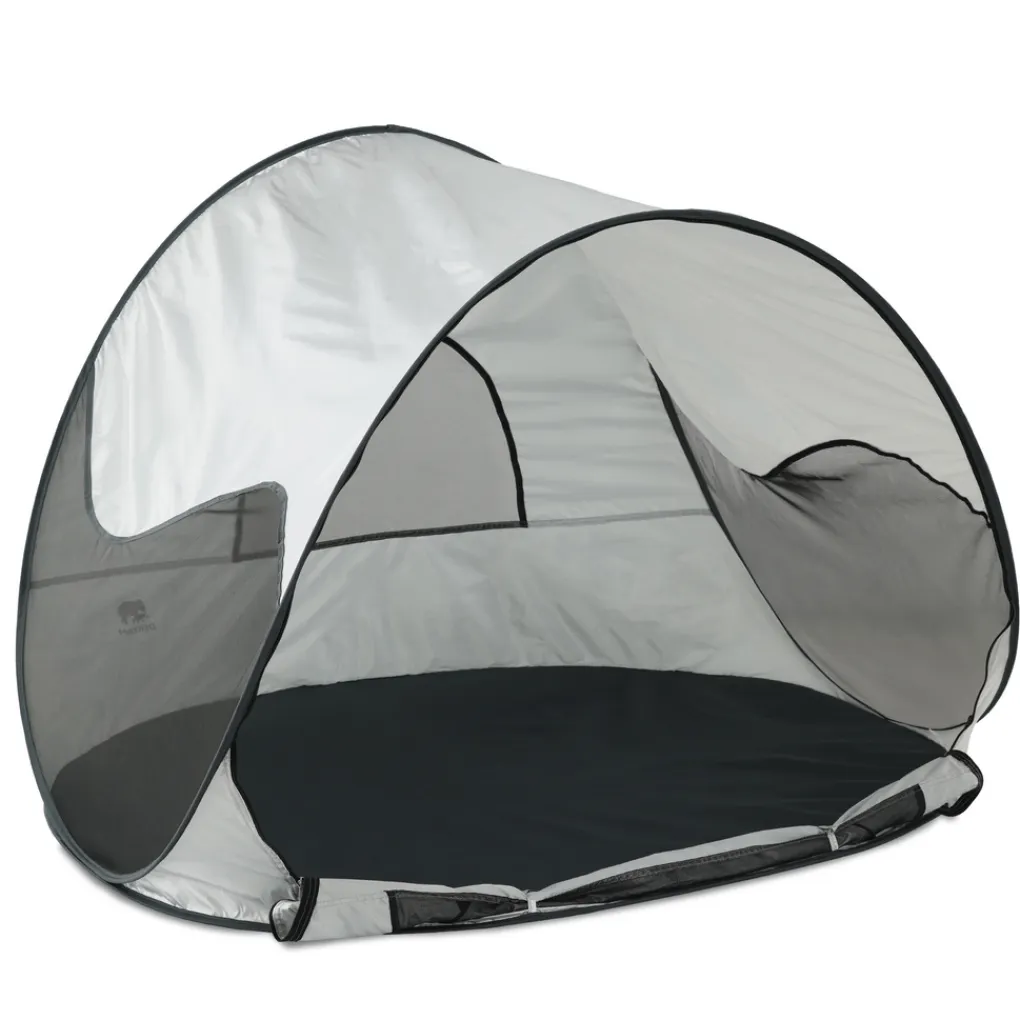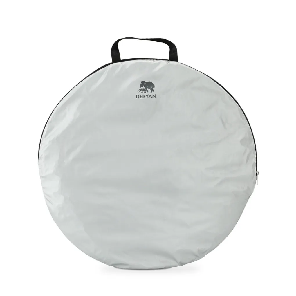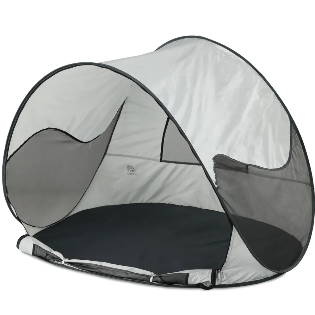 Het is snel op te zetten en in elkaar te vouwen. Naast dat het licht van gewicht is, biedt de Deryan Beachtent extra bescherming tegen wind en zand. De Beachtent bevat een aflopende vorm, waardoor hij goed de wind in gepositioneerd kan worden. Tevens zit er een raam van mesh achterin de tent, welke desgewenst dichtgemaakt worden. Aan de achterzijde van de tent bevinden zich lusjes om de DERYAN Beachtent door middel van haringen vast te zetten, alsook zakjes om met zand de stevigheid te optimaliseren. De Beachtent is gemakkelijk te dragen met de handige draagtas.