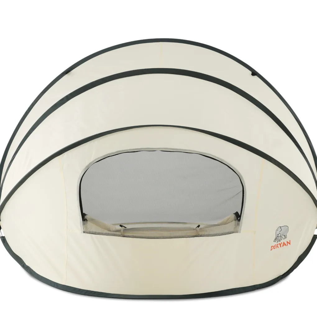 De XXL strandtent heeft een hellend ontwerp waardoor hij ook in de zon geplaatst kan worden. De pop-uptent is ontworpen met een snel in- en uitklapmechanisme. De tent heeft aan de achterkant lussen om de DERYAN tent vast te zetten met haringen, en hij heeft vakken om de stevigheid in het zand te optimaliseren.