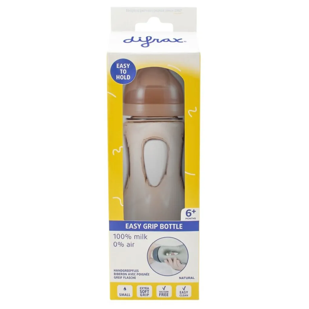 De Difrax Handgreepfles is geschikt vanaf het moment dat je kindje rechtop kan zitten en graag zelf uit de babyfles wilt drinken. Kinderen kunnen de fles gemakkelijk zelf vasthouden door de opening in het midden.