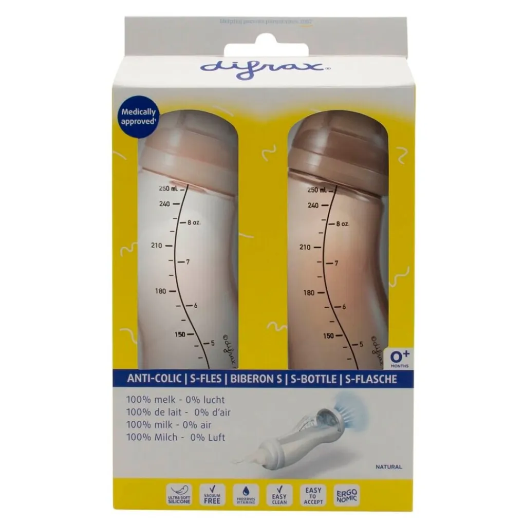 De Difrax Natural 0+M S-Fles met anti-koliekwerking is geschikt voor 250 ml flesvoeding of borstvoeding. De babyfles is te gebruiken vanaf de geboorte.