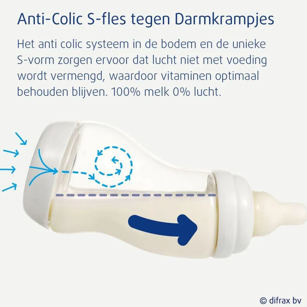De constante luchttoevoer vanuit de bodem van de S-fles voorkomt vacuüm trekken, zodat je kindje probleemloos kan drinken. Tijdens flesvoeding zit je automatisch in de juiste houding. Zelfs als de fles bijna leeg is.