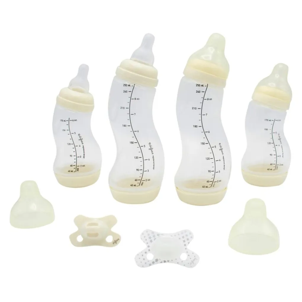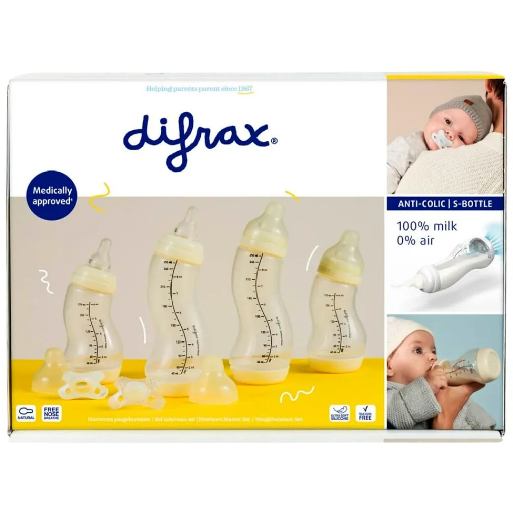 De Difrax Starterset Pasgeborenen bevat de beste babyproducten. Zo bevat de newborn set onder andere de beste anti-koliek babyfles en de best geaccepteerde fopspeentjes van Difrax.