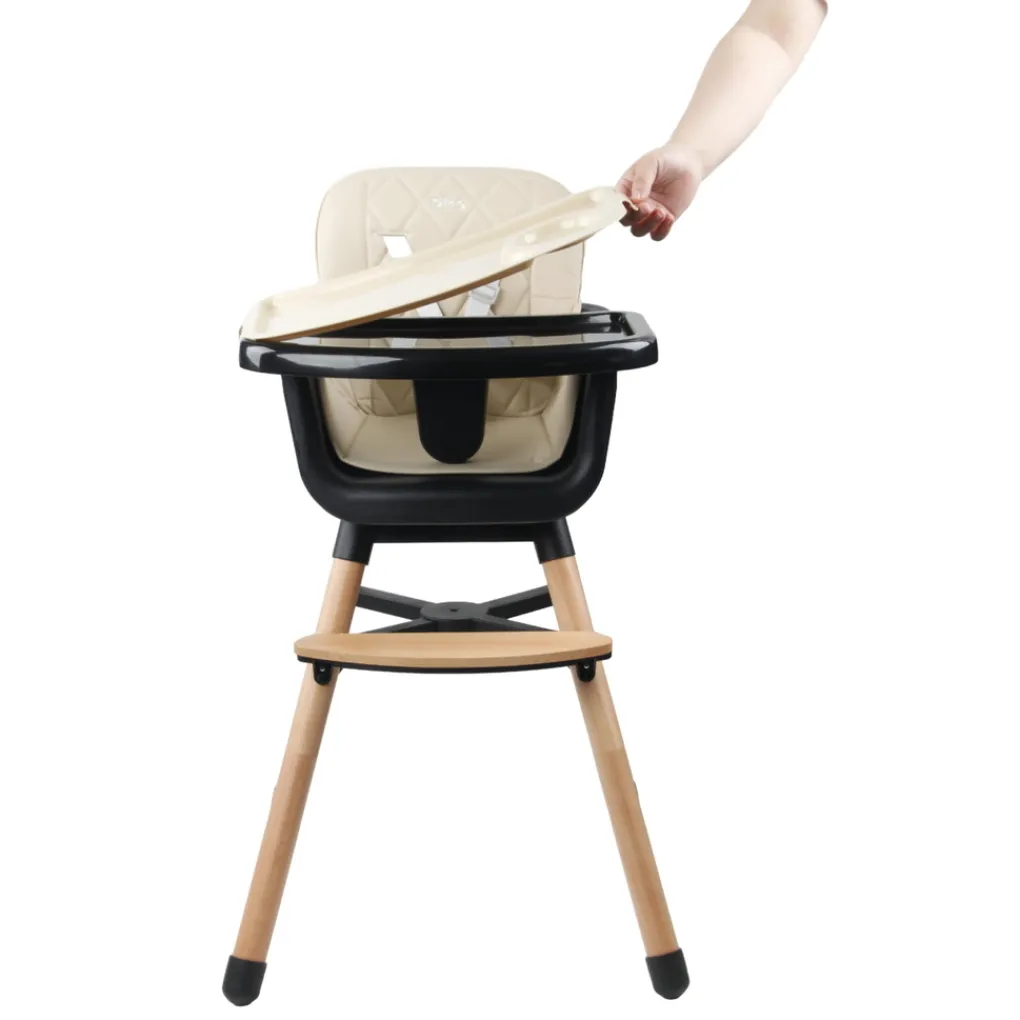 De stoelpoten en voetensteun zijn gemaakt van beukenhout, wat de kinderstoel een luxe en moderne uitstraling geeft. Zo zal hij niet misstaan in de keuken of eetkamer! Wanneer je kindje de kinderstoel niet meer nodig heeft, tover je hem gemakkelijk om tot een lage peuterstoel door de hoge poten en het veiligheidstuigje weg te halen.