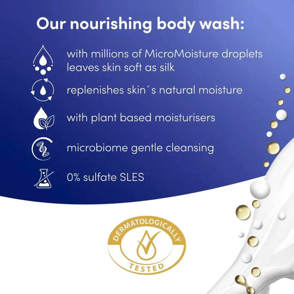 De douchecrème bevat reinigende bestanddelen op natuurlijke basis en vochtinbrengende bestanddelen op plantaardige basis. De hydraterende formule is verrijkt met 24 uur vernieuwende micro moisture. Hij voedt en helpt de natuurlijke vochtbarrière van je huid te versterken. Door je huid te helpen hydrateren, zorgt deze hydraterende douchecrème er niet alleen voor dat je huid direct zachter aanvoelt, maar hij helpt je huid ook te voeden voor een langdurige verzorging.