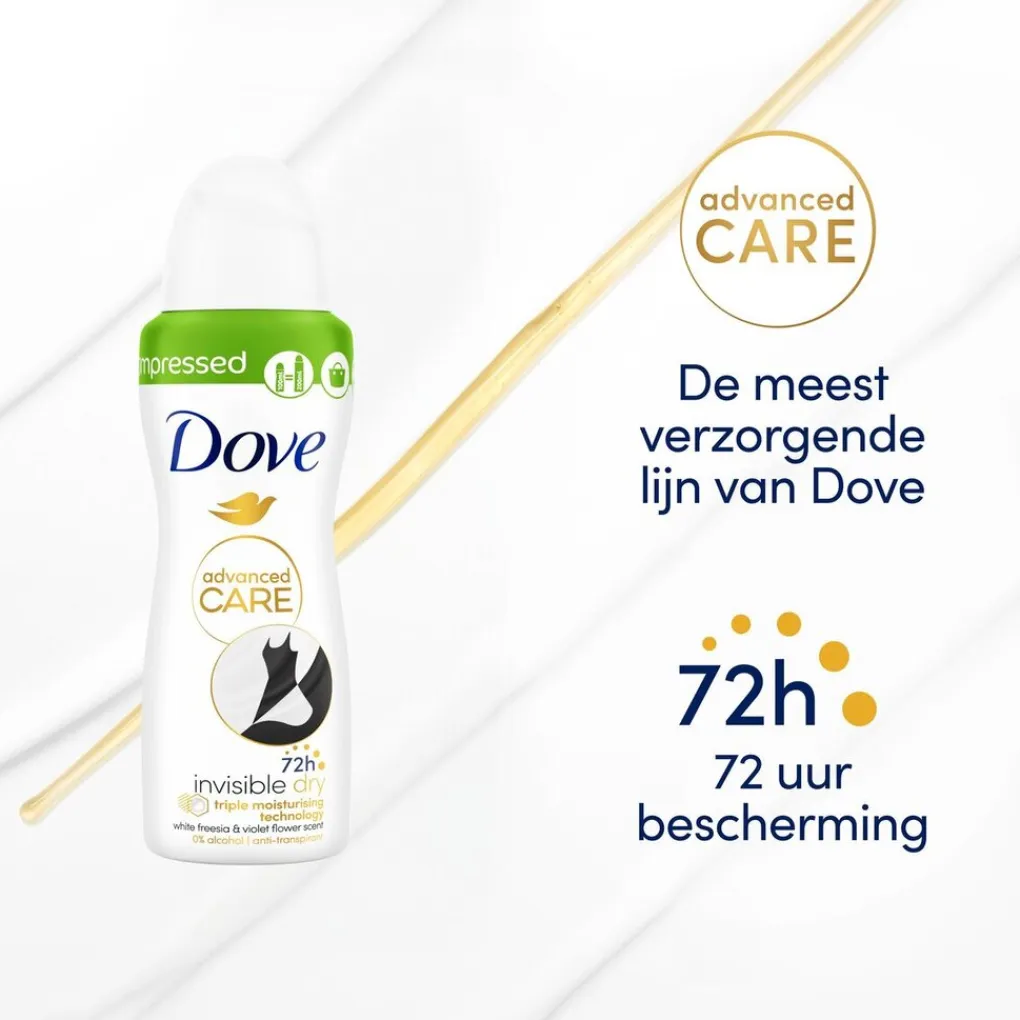 De Dove Invisible Care Dry Deodorant Spray laat geen witte strepen of gele vlekken achter. De spray is getest op 100 kleuren met bewezen resultaat.