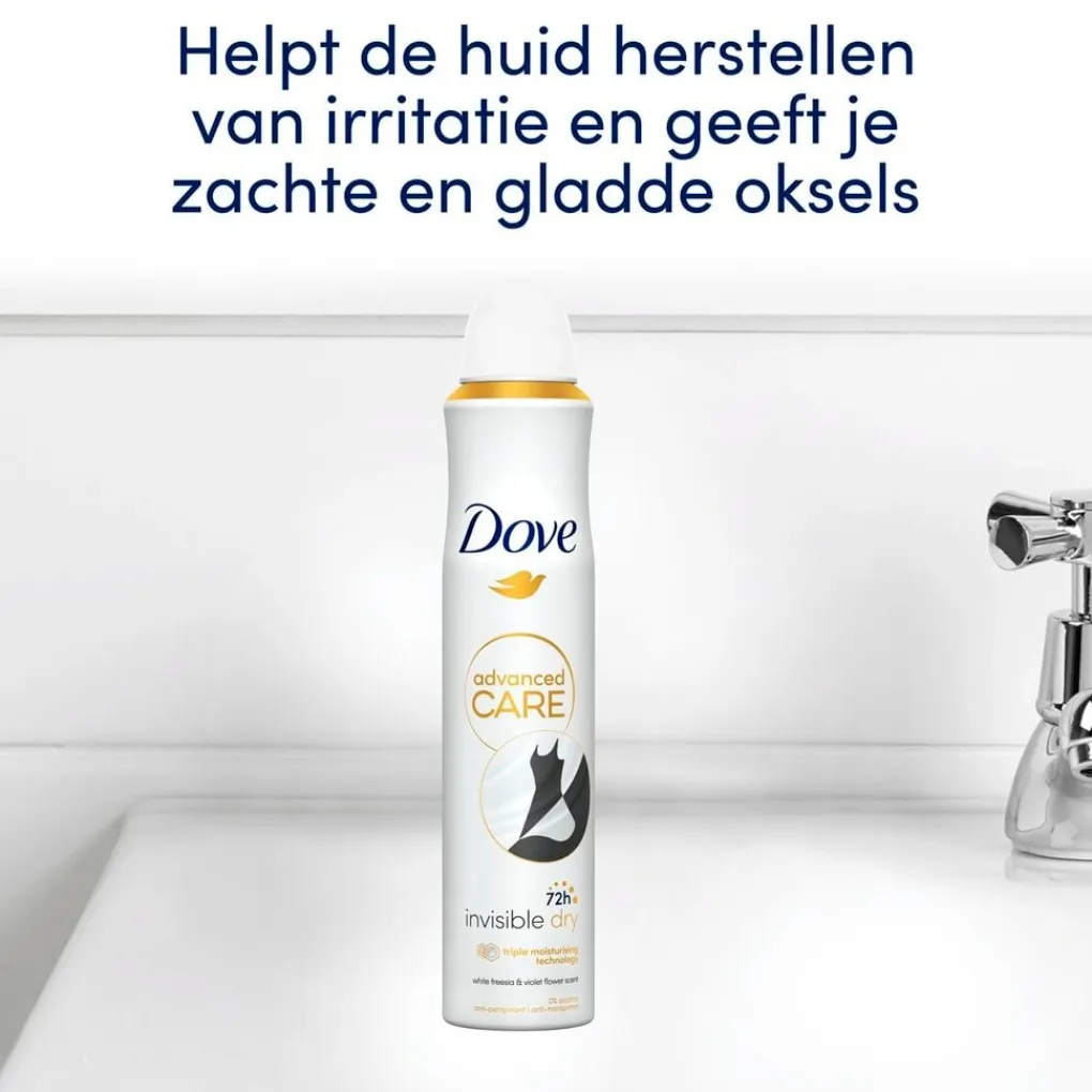 De Dove Invisible Care Dry Deodorant Spray laat geen witte strepen of gele vlekken achter. De spray is getest op 100 kleuren met bewezen resultaat.