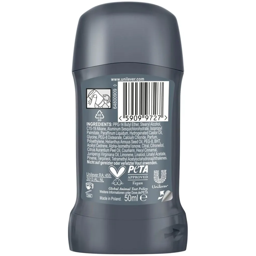 INGREDIENTS: PPG-14 Butyl Ether, Stearyl Alcohol, C15-19 Alkane, Aluminum Sesquichlorohydrate, Isopropyl Palmitate, Paraffinum Liquidum, Hydrogenated Castor Oil, Glycine, PEG-8 Distearate, Calcium Chloride, Parfum, Polyethylene, Helianthus Annuus Seed Oil, PEG-8, BHT, Alpha-Isomethyl Ionone, Amyl Salicylate, Benzyl Alcohol, Citral, Citronellol, Coumarin, Hexyl Cinnamal, Juniperus Virginiana Oil, Limonene, Linalool, Pinene, Terpineol, Tetramethyl Acetyloctahydronaphthalenes.