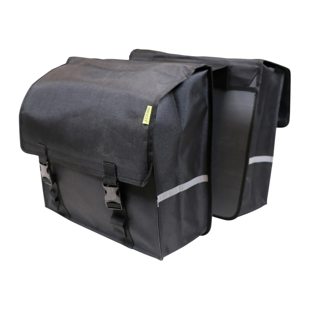 Dubbele zwarte fietstas met reflecterende accenten. Makkelijk te bevestigen op de bagagedrager door de verstelbare banden. De fietstassen zijn gemaakt van waterafstotend nylon met twee verstelbare snel sluitingen. Daarnaast zijn de tassen voorzien van een verstevigde rug en bodem.