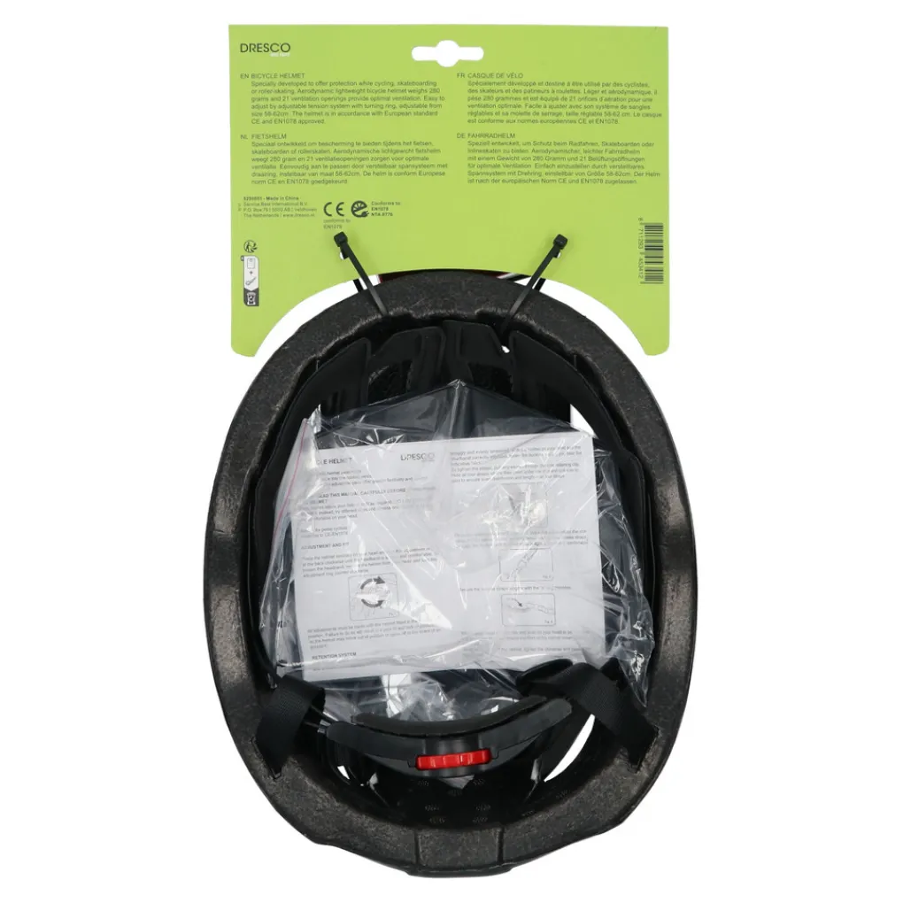 Dresco fietshelm in een mat zwarte kleur, speciaal ontwikkeld om bescherming te bieden tijdens het fietsen, skateboarden of rollerskaten. Aerodynamische lichtgewicht fietshelm weegt 280 gram en 21 ventilatieopeningen zorgen voor optimale ventilatie. Eenvoudig aan te passen door verstelbaar spansysteem met draairing, instelbaar van maat 58-6cm. De zachte verstelbare kinband en afneembare en verstelbare pads zorgen voor flexibiliteit en comfort. De helm is conform Europese norm CE en EN1078 goedgekeurd.