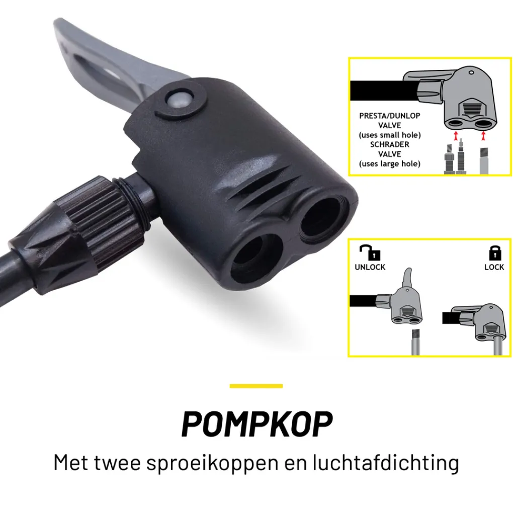Presta of Franse ventielen zijn geschikt voor sportieve fietsen zoals mountainbikes en racefietsen. Dunlop of Hollandse ventielen zitten veelal op reguliere stadsfietsen, en Schrader of auto ventielen zijn naast mountainbikes ook geschikt voor scooters en auto’s.Specificaties Dunlop fietspomp