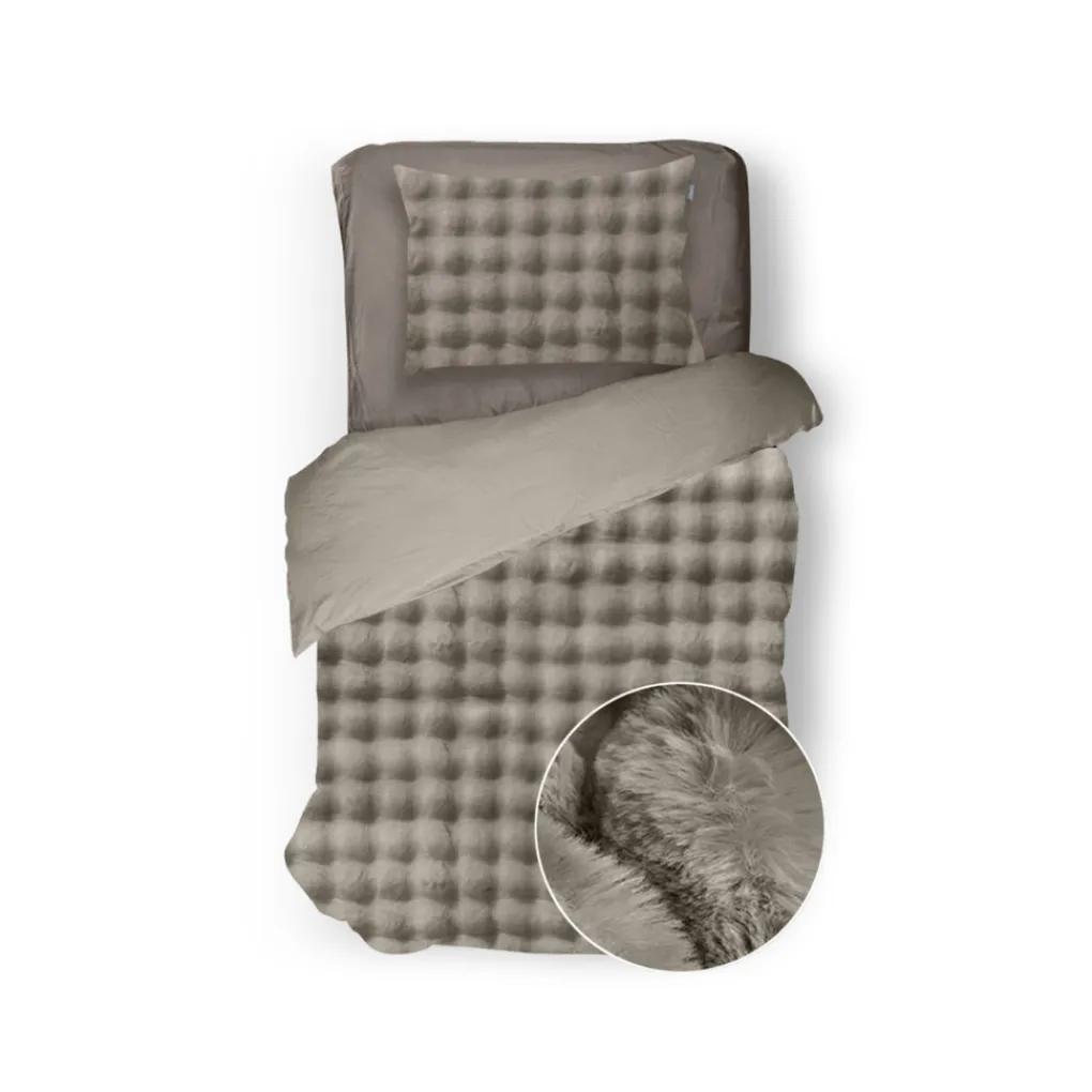 De bovenzijde is gemaakt van shiny flanel fleece met bubble structuur: superzacht met een voelbaar patroon. De onderzijde is van soepele microperkal, licht en ademend, waardoor je het nooit te benauwd krijgt. Dankzij de ritssluiting aan de onderkant blijft je dekbed netjes op z’n plek.