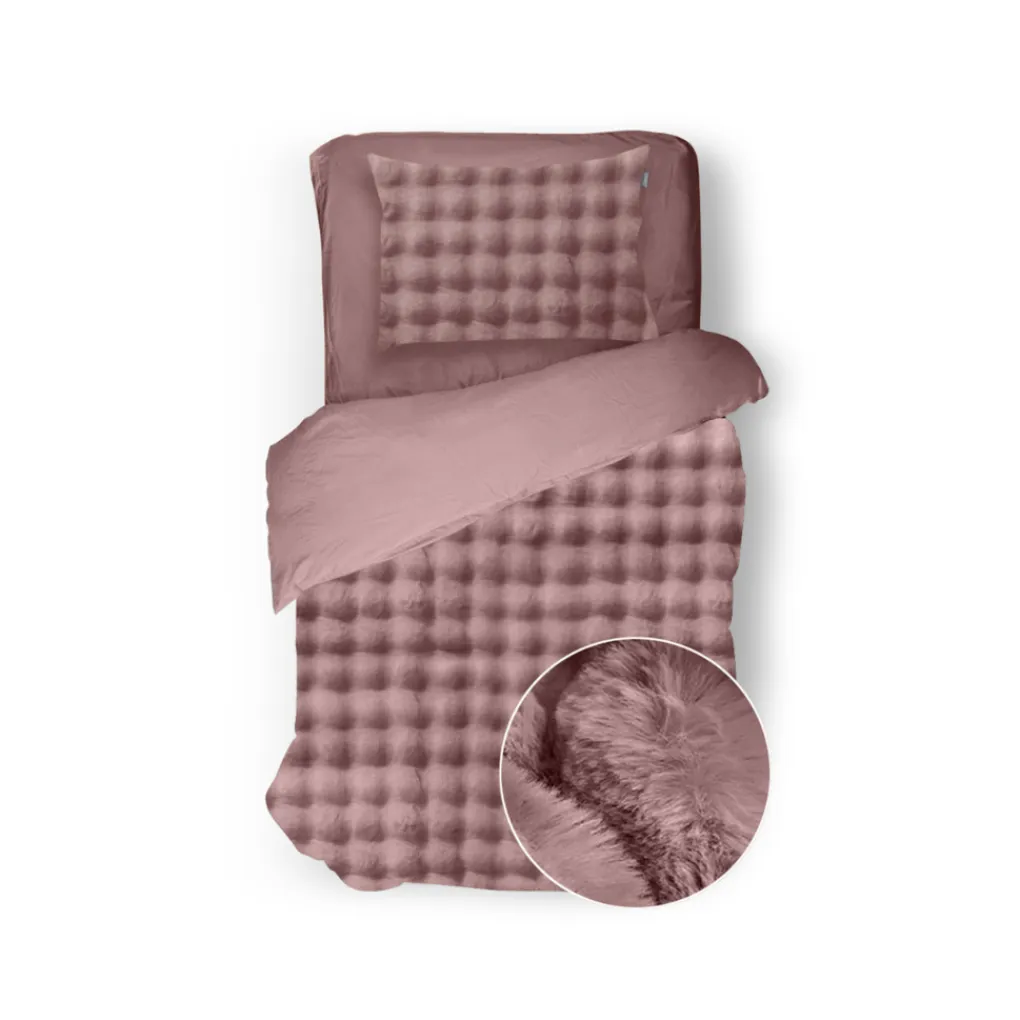 De bovenzijde is gemaakt van shiny flanel fleece met bubble structuur: superzacht met een voelbaar patroon. De onderzijde is van soepele microperkal, licht en ademend, waardoor je het nooit te benauwd krijgt. Dankzij de ritssluiting aan de onderkant blijft je dekbed netjes op z’n plek.