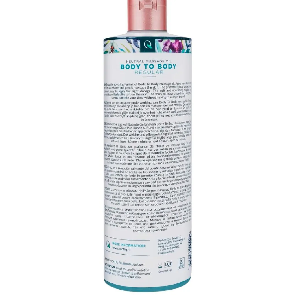 Exotiq Body to Body Regular Massageolie is perfect voor massages. De zijdezachte olie laat je handen soepel over het lichaam glijden en helpt de spieren ontspannen.
