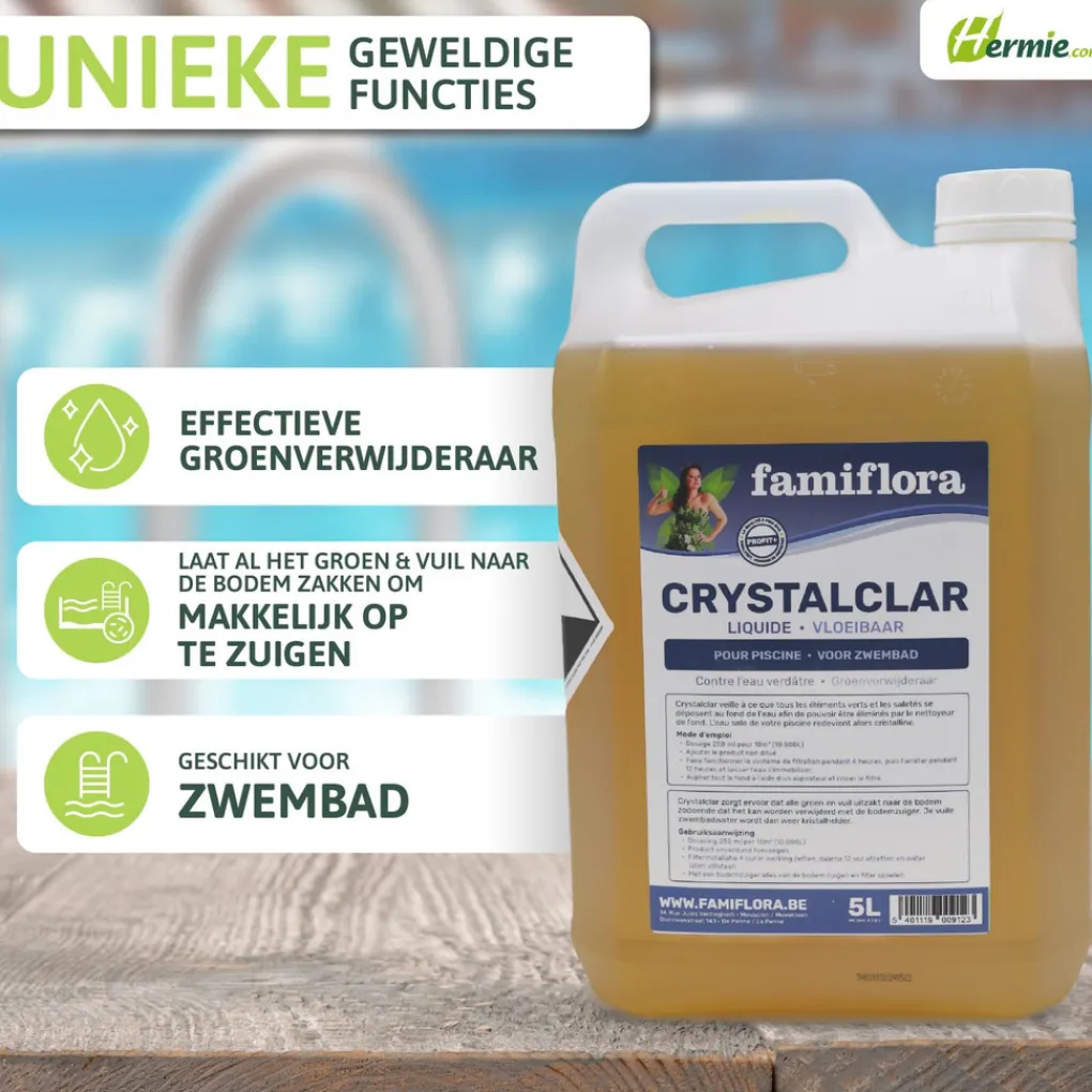 Crystalclar zorgt ervoor dat alle groen & vuil uitzakt naar de bodem zodat het makkelijk opgezogen kan worden door de bodemzuiger. Zo wordt het vuile zwembadwater opnieuw kristalhelder!Dosis: