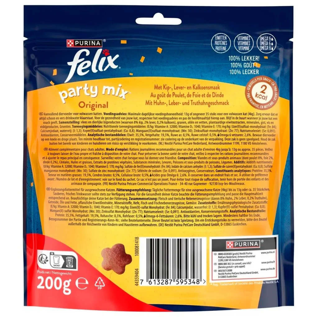 Dat is niet alles! Felix Party Mix bevat eiwitten, vitaminen en omega 6-vetzuren die helpen bij een gezond en gelukkig leven voor je kat.