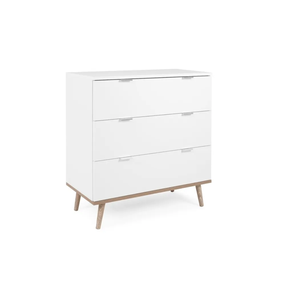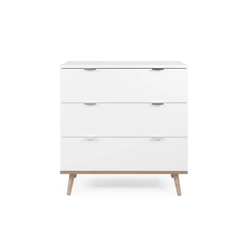 De luxe commode Göteborg van Finori heeft een moderne en Scandinavische look. De Göteborg-collectie is een mix van naturel oak en strak wit. De commode is voorzien van 3 ruime lades en staat op schuine, ranke pootjes. De commode biedt voldoende opbergruimte en is leuk in te richten met bijvoorbeeld mandjes. Zo heb je altijd alles snel bij de hand tijdens het verschonen.