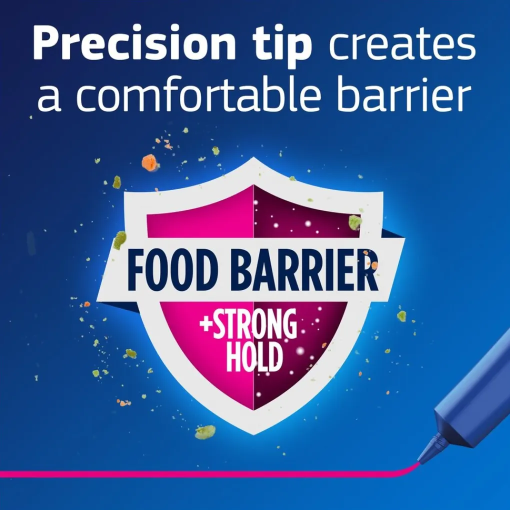 • Creëert een speciale voedselbarrière, die voorkomt dat voedseldeeltjes onder de gebitsprothese komen