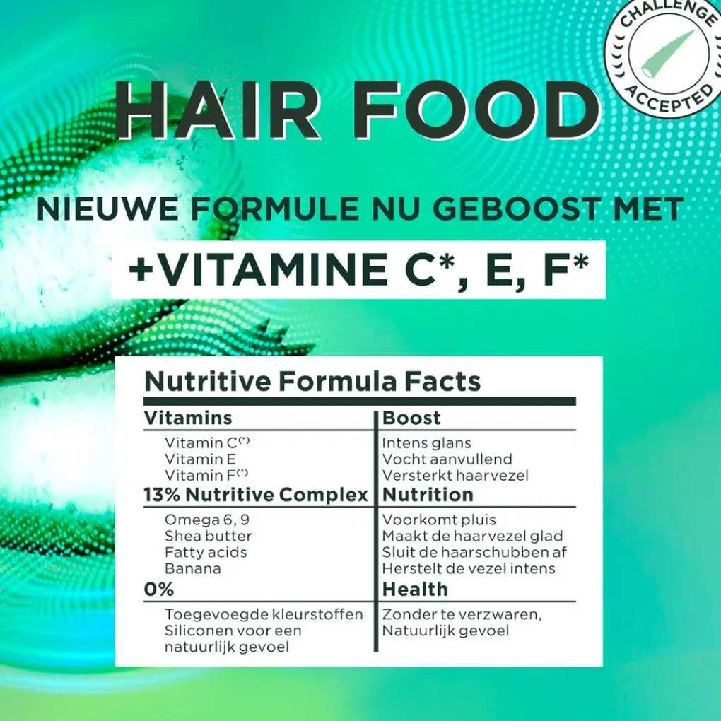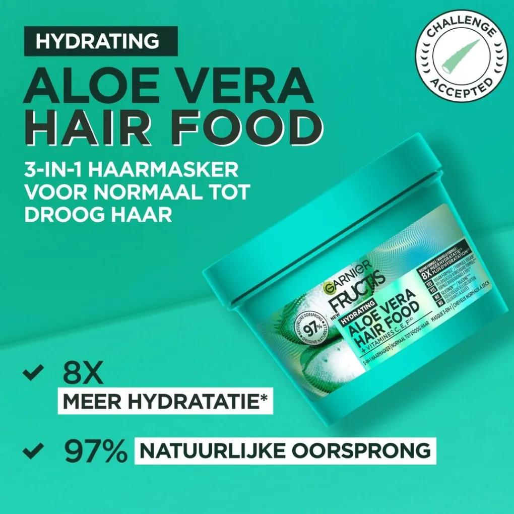 Het Garnier Fructis Hairfood Aloë Vera Haarmasker is vegan haarverzorging op basis van fruit vol voedingsstoffen. 97% van de ingrediënten is van natuurlijke oorsprong. Het masker is geschikt voor normaal tot droog haar.