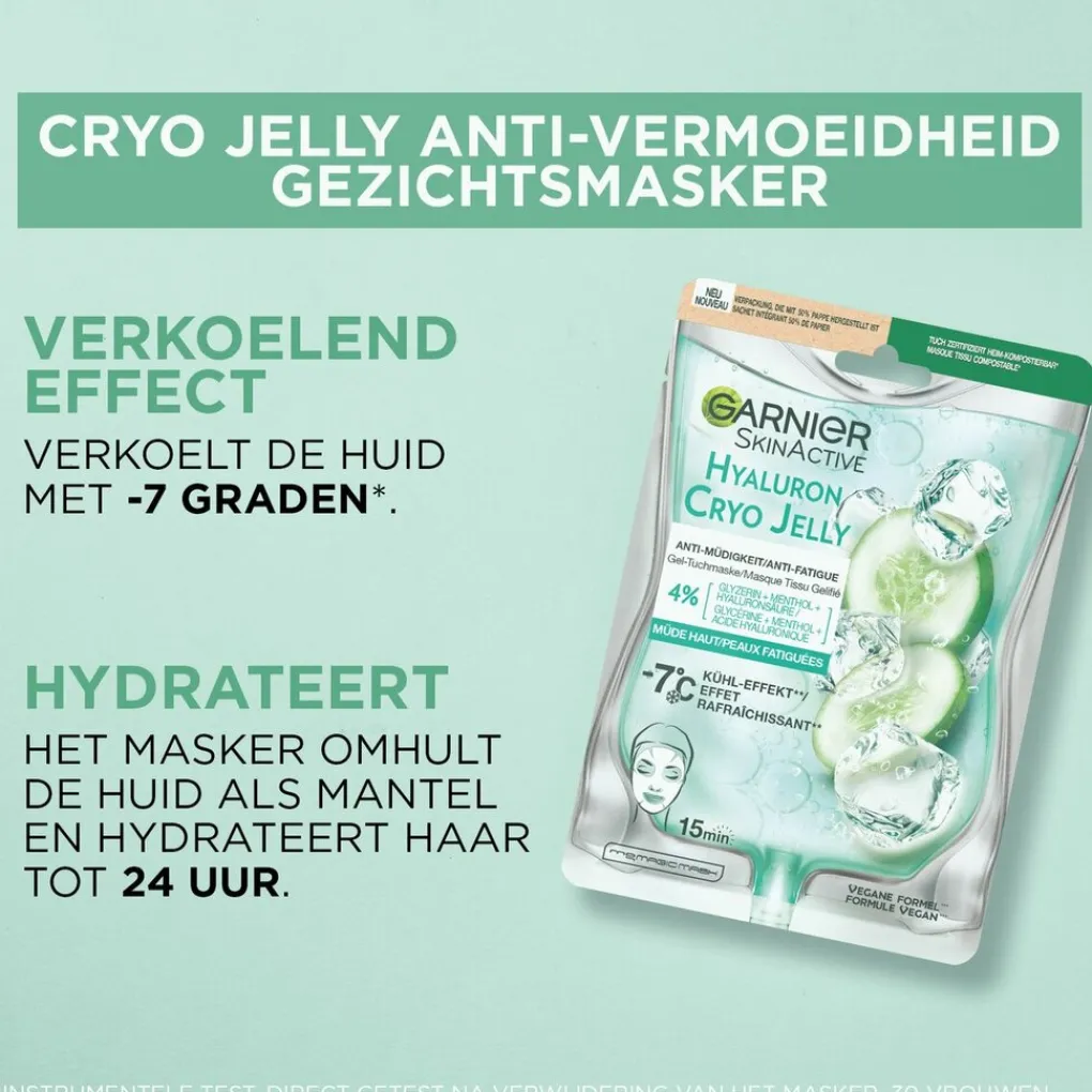 Vermoeide huid? Ontdek het verkoelende Garnier SkinActive Cryo Jelly Anti-Vermoeidheid Gezichtsmasker met Hyaluronzuur dat aanvoelt als een tweede huid met een verkoelend effect.