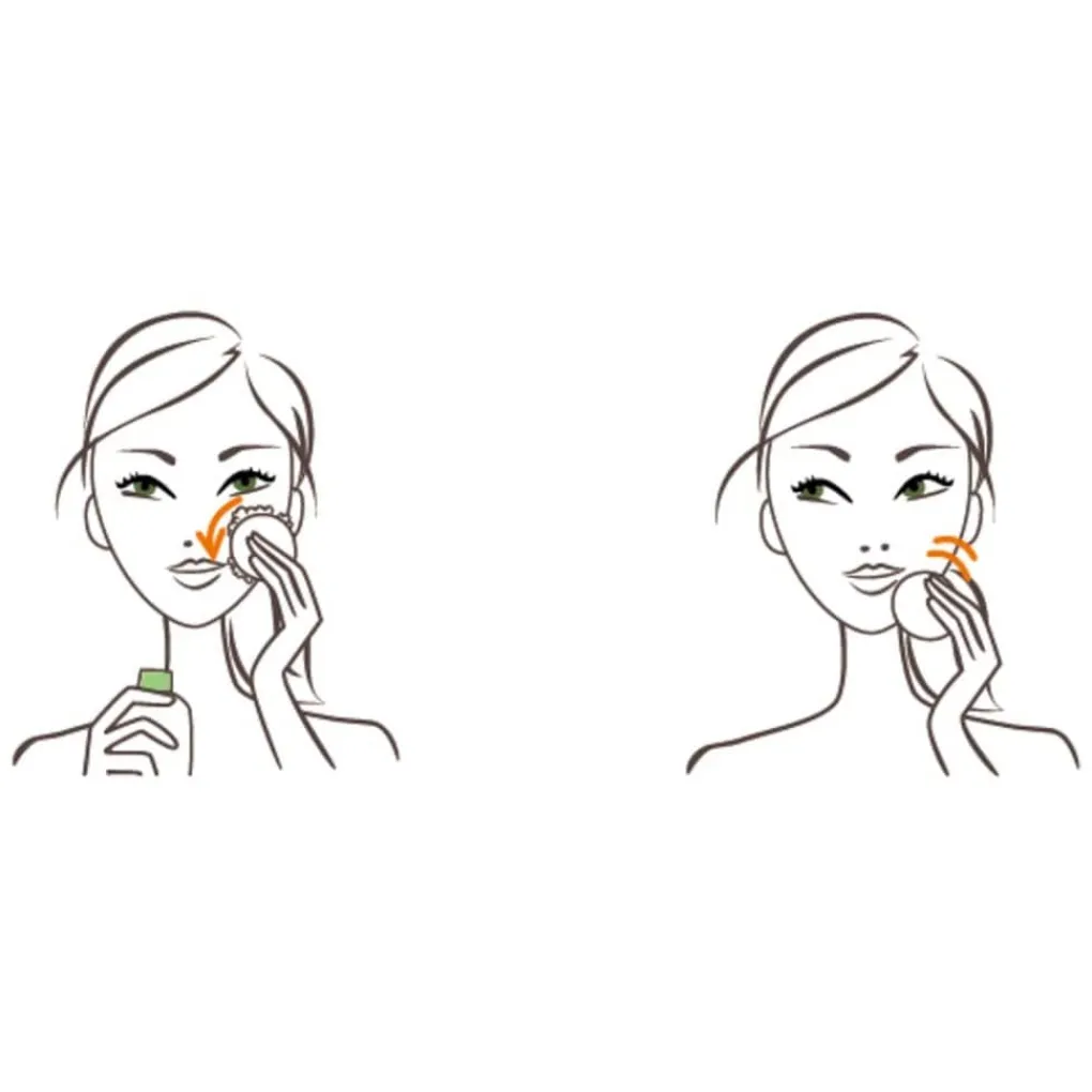 Stap 4: reinig je gezichtshuid Haal het wattenschijfje met micellair reinigingswater over je gehele gezicht. Begin aan de buitenkant rondom je gezicht, ga dan richting je wangen, voorhoofd en eindig met je hals. Maak de juiste beweging: van de hals, naar de bovenkant van je gezicht, en vervolgens van je neus richting je oren. Gebruik iets meer druk op je T-zone: voorhoofd, neus en kin.