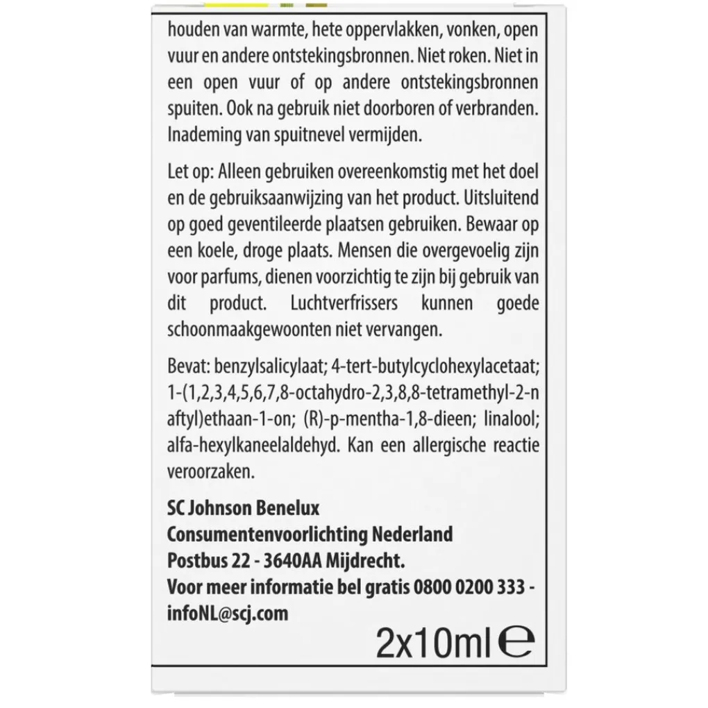 EUH208: Bevat (naam van de sensibiliserende stof). Kan een allergische reactie veroorzaken.H222: Zeer licht ontvlambare aerosol.H229: Houder onder druk: kan openbarsten bij verhitting.H317: Kan een allergische huidreactie veroorzaken.H319: Veroorzaakt ernstige oogirritatie.H412: Schadelijk voor in het water levende organismen, met langdurige gevolgen.