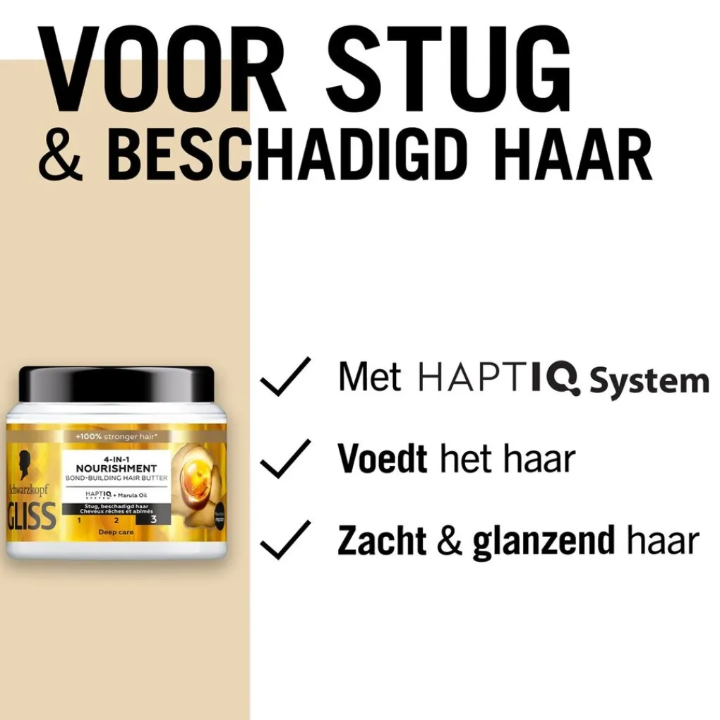 Het Gliss 4-In-1 Nourishment Bond-Building Haarmasker heeft een Gliss care level 3. Dit betekent diepe verzorging, met diep herstellende formules met hoogwaardige ingrediënten.