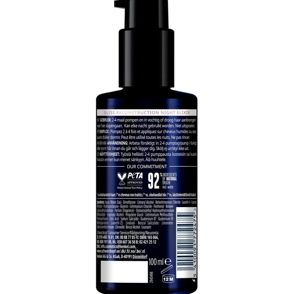 De Gliss Overnight Reconstruction Night Elixir herstelt je beschadigde haar met gespleten haarpunten tijdens de nacht. De lichtgewicht formule met een ontspannende geur laat geen restjes achter op je hoofdkussen.