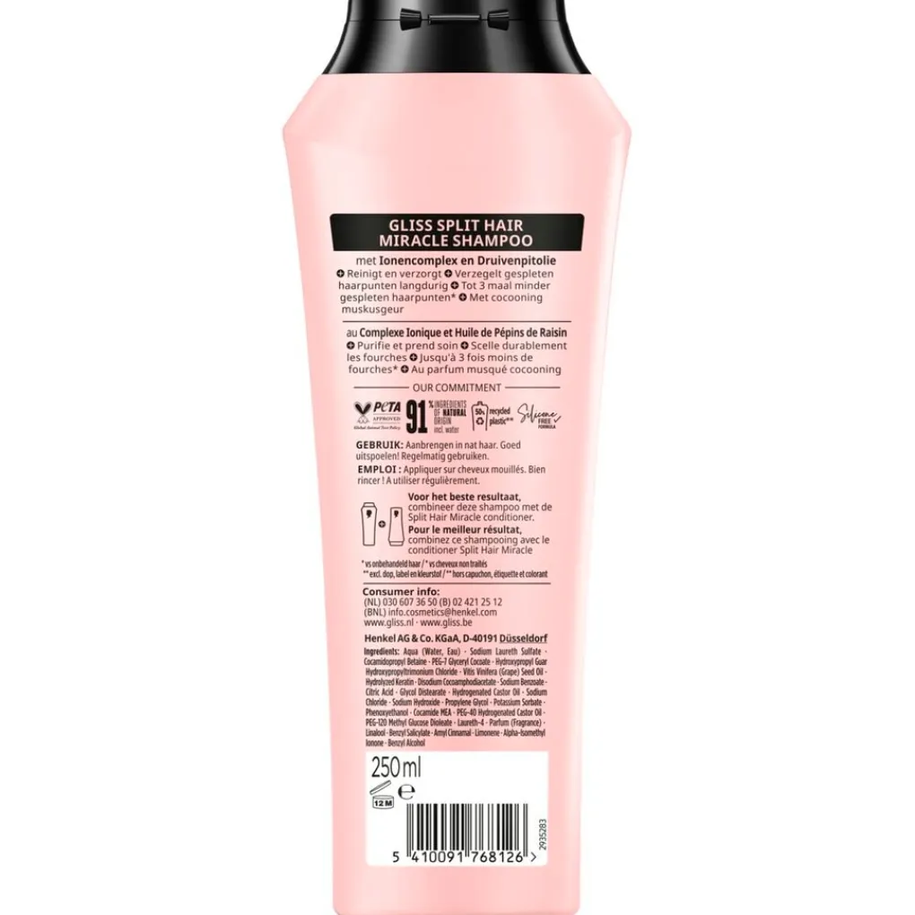 Hoe gebruik je de Gliss Split Hair Miracle Shampoo? Aanbrengen in nat haar, inmasseren en goed uitspoelen. Regelmatig gebruiken. Voor het beste resultaat, combineer deze shampoo met een Gliss conditioner.