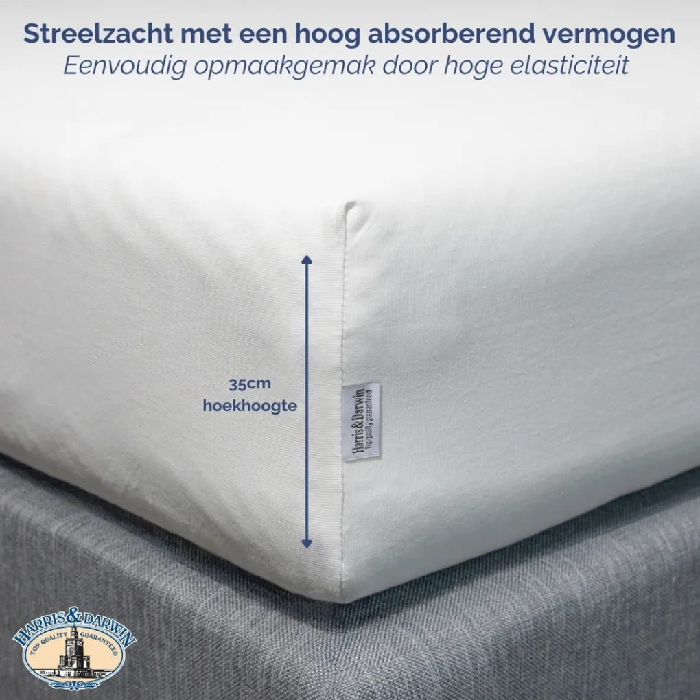 Het Harris&Darwin Jersey hoeslaken combineert kwaliteit met comfort, ideaal voor iedereen die waarde hecht aan een goede nachtrust. De hoogwaardige jersey-stof voelt heerlijk zacht aan op de huid, terwijl de toevoeging van lycra zorgt voor een elastische pasvorm die goed blijft zitten, nacht na nacht. De stof ademt goed, zodat je bed koel en fris blijft, zelfs tijdens warmere nachten.Oeko-Tex Made In Green-certificering: