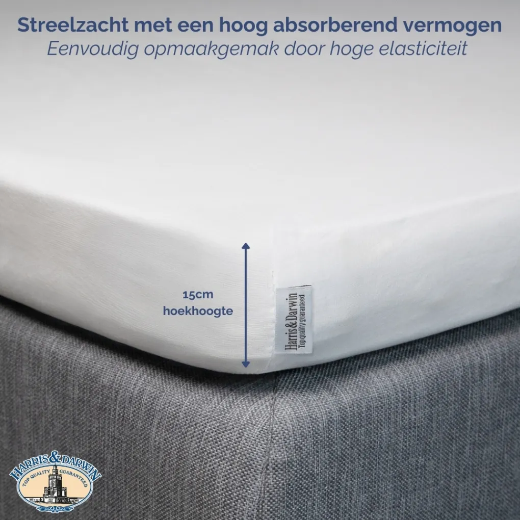 Het Harris&Darwin Jersey hoeslaken combineert kwaliteit met comfort, ideaal voor iedereen die waarde hecht aan een goede nachtrust. De hoogwaardige jersey-stof voelt heerlijk zacht aan op de huid, terwijl de toevoeging van lycra zorgt voor een elastische pasvorm die goed blijft zitten, nacht na nacht. De stof ademt goed, zodat je bed koel en fris blijft, zelfs tijdens warmere nachten.Oeko-Tex Made In Green-certificering: