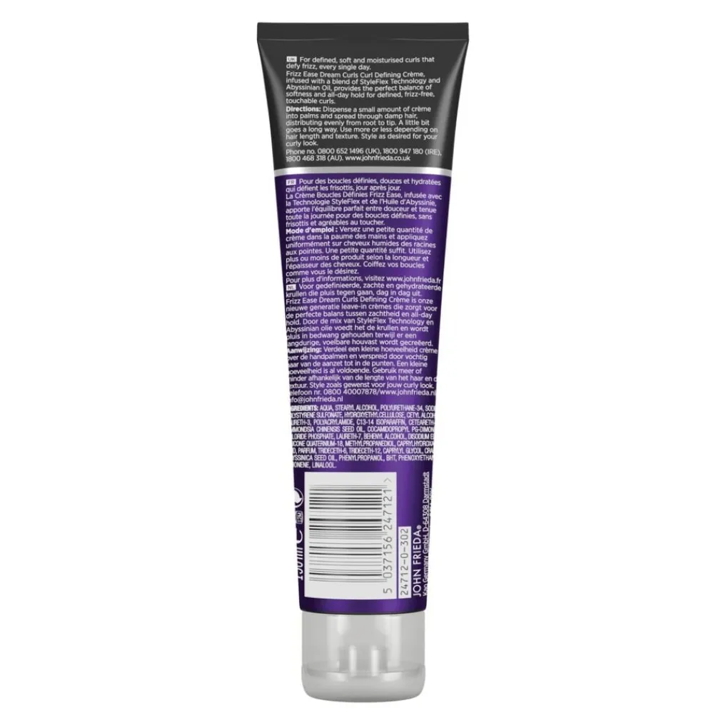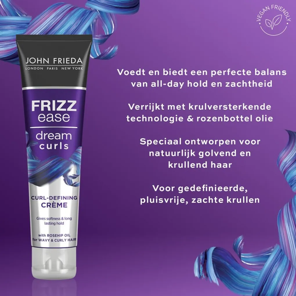 John Frieda Frizz Ease Dream Curls Curl Defining Crème zorgt voor gedefinieerde, zachte en gehydrateerde krullen zonder pluis. De crème met rozenbottel-olie en krulversterkende technologie is geschikt voor alle soorten pluizig haar.