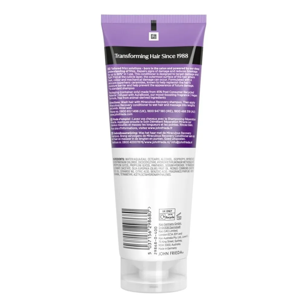 Verzorg doelgericht beschadigde zones in je haar met de John Frieda Frizz Ease Miraculous Recovery Repairing Conditioner. De conditioner herstelt pluizig en beschadigt haar en gaat haarbreuk tegen.
