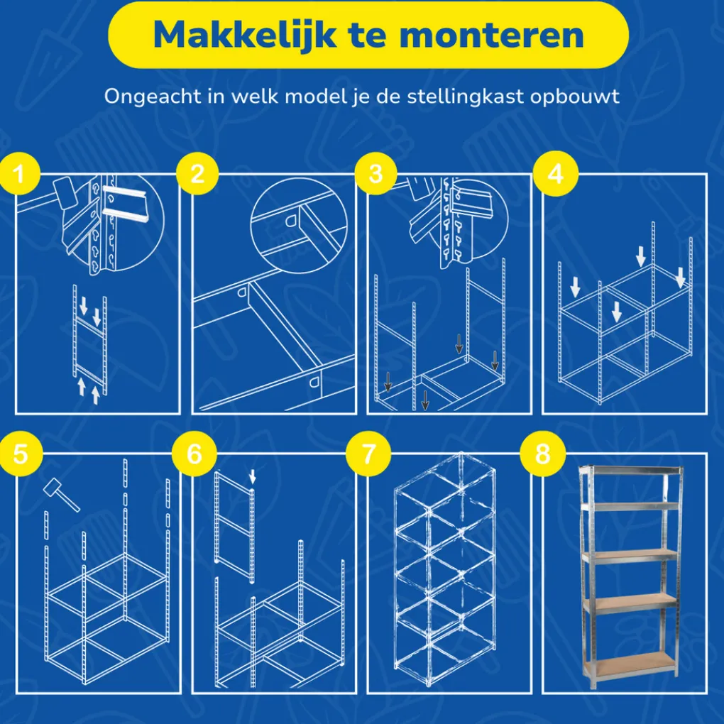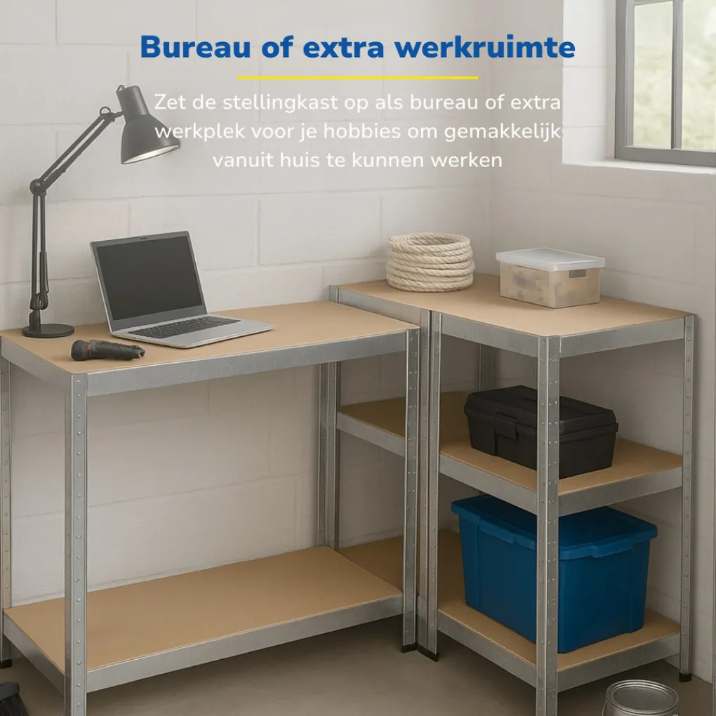 Dit opbergrek van Kinzo kan heel wat hebben. Daarom is deze stellingkast ook zo geschikt om op zolder, in de garage, schuur of andere bergruimte te dienen als opslag voor zware materialen, gereedschap, voorraad, boxen en dozen en alle andere zwaardere zaken die je graag netjes wilt opbergen. Kan in totaal 750 kilo dragen In totaal draagt dit opbergrek maar liefst 750 kilo. Aangezien dit opbergrek 5 legplanken heeft is dat 150 kilo per plank. De kast zelf is circa 172 x 75 x 30 centimeter. Er kan dus heel wat in opgeslagen worden. Staat binnen 10 minuten Je krijgt deze stellingkast als bouwpakket. Het opbergrek in elkaar zetten is een fluitje van een cent zeker met de duidelijke handleiding erbij. Er komen helemaal geen schroeven aan te pas. De metalen houders hebben klemmetjes die je gemakkelijk in elkaar schuift. Binnen 10 minuten staat je opbergrek! De stevige planken zijn gemaakt van MDF van 4 millimeter dik. Je legt ze op de dragers zodat er een zeer stevig geheel ontstaat. Op diverse manieren op te zetten Je kunt deze stellingkast op diverse manieren opzetten. Verticaal opgezet is het een handige kast met 5 planken onder elkaar. Horizontaal opgebouwd kun je de bovenkant van dit opbergrek ook nog als werkblad gebruiken. Mocht je durven: Deze stellingkast staat ook mooi in een industrieel interieur. Bijvoorbeeld als boekenkast, keukenkast of om je mooie spulletjes in uit te stallen.