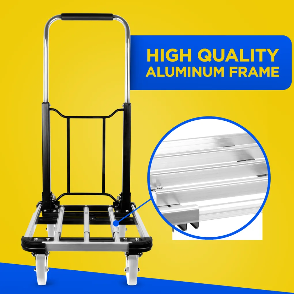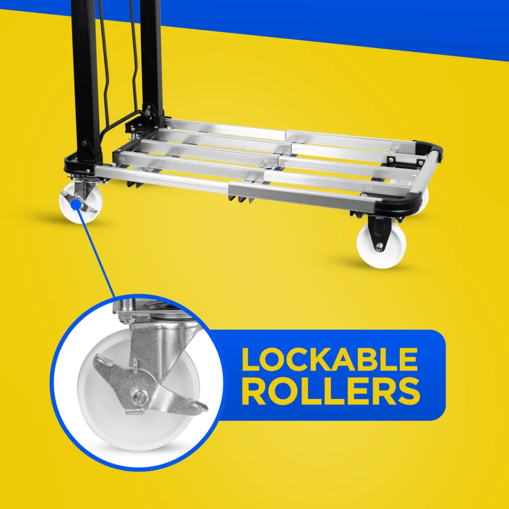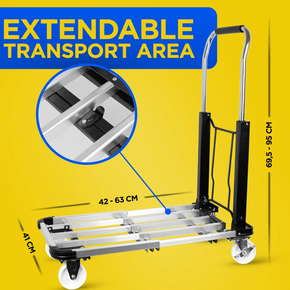 Inklappen maar De kar heeft een duwbeugel met een softgrip handvat. De afmetingen van de trolley zijn 71 x 41 x 94,5 cm centimeter. Gebruik je de transportwagen niet dan klap je hem in zodat je hem compact kunt opbergen. Je kunt de duwbeugel inklappen en het platform in elkaar schuiven zodat hij nog minder plaats inneemt. Het karretje meet opgevouwen 56 x 41 x 23 cm.