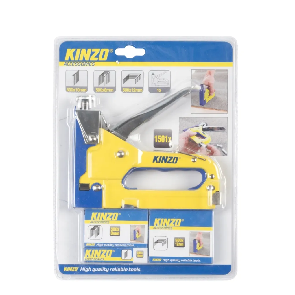 Een tacker of nietmachine is ideaal voor het nieten van bijvoorbeeld vloerbedekking op een houten ondergrond, meubels stofferen en andere klussen waarbij je iets moet bevestigen. Deze robuuste nieter van Kinzo is traploos instelbaar en gemakkelijk te gebruiken. Meteen aan de slagJe krijgt er voldoende materiaal bij om meteen aan de slag te gaan. Naast de tacker zitten er ook 500 spijkers van 10 millimeter, 500 nietjes van 12 millimeter en 500 nieten van 8 millimeter in het pakket.