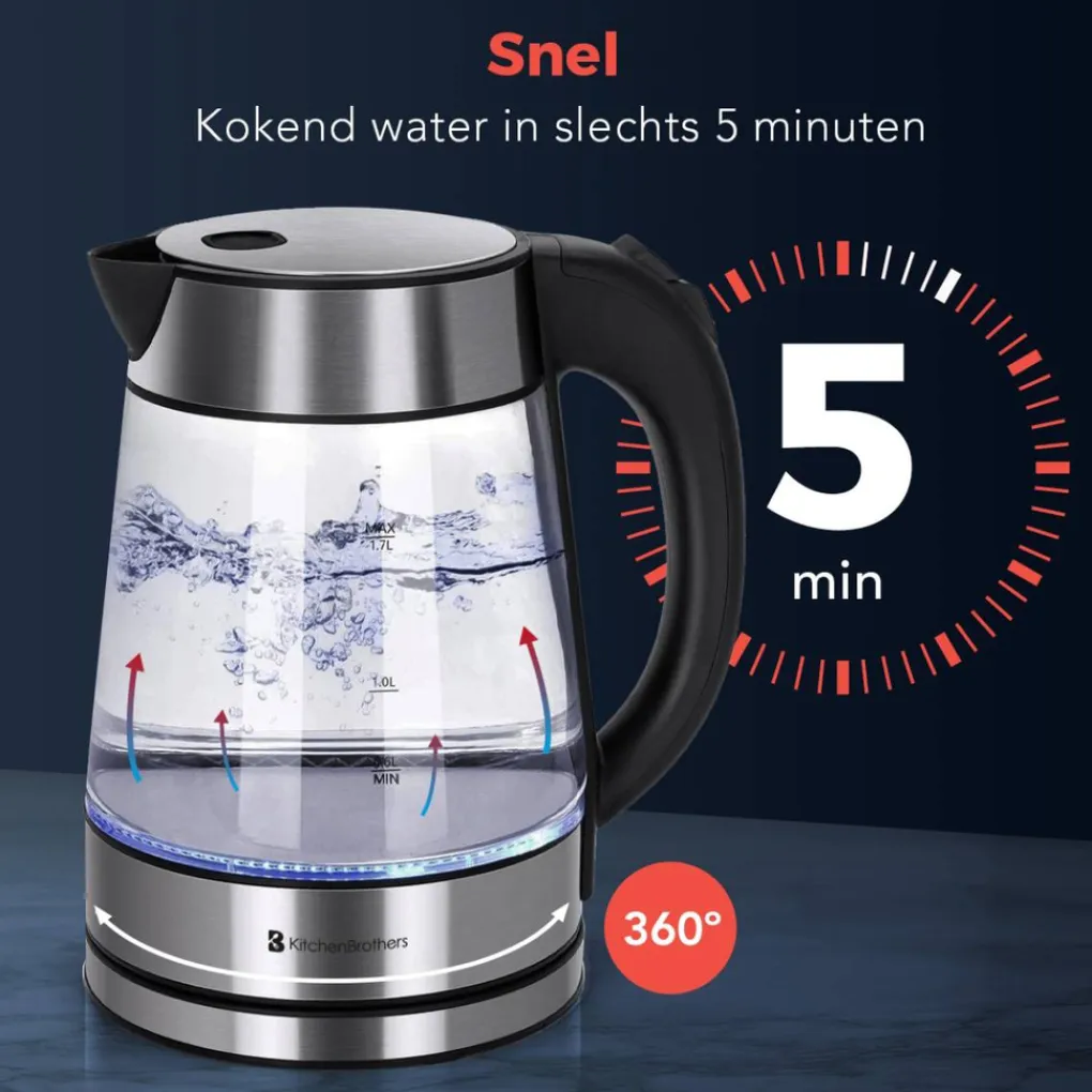 Veilig en duurzaamBij KitchenBrothers staat veiligheid voorop. De waterkoker heeft een droogkookbeveiliging en schakelt automatisch uit. Daarnaast is de waterkoker zelf gemaakt van hoogwaardig borosilicaatglas. Dit glas is zeer duurzaam, breekt niet snel en is resistent tegen vlekken.