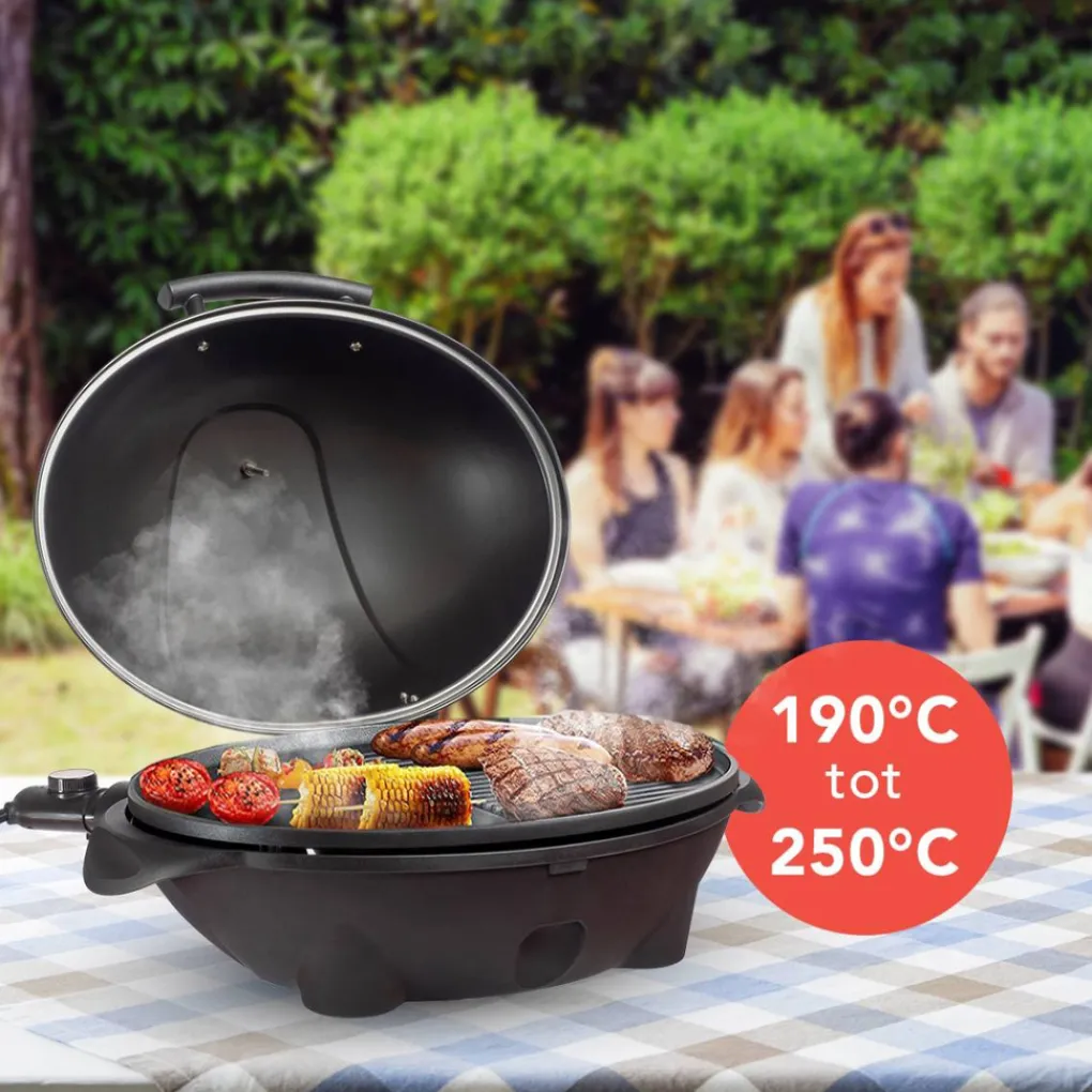 5 hittestanden Geen zin meer om te wachten tot de kooltjes van de barbecue eindelijk warm genoeg zijn? Met de KitchenBrothers elektrische barbecue kan je bijna direct beginnen met grillen. Doe de thermostaat in de barbecue en de stekker in het stopcontact. De krachtige 2400W elektrische barbecue is in 5 tot 10 minuten is de barbecue opgewarmd. Daarbij kan je de barbecue op 5 verschillende hittestanden zetten (190 – 250℃). Zo brandt je eten niet aan.