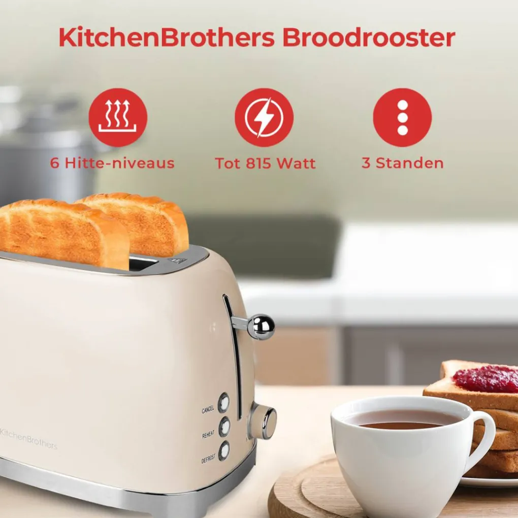 3 standen: Normaal, opwarmen, ontdooien De broodrooster van KitchenBrothers heeft 3 standen. Kies uit Normaal, Opwarmen of Ontdooien. Het rode LED lampje geeft aan welke stand je gekozen hebt. Zo rooster je elke keer weer een perfect stukje brood!