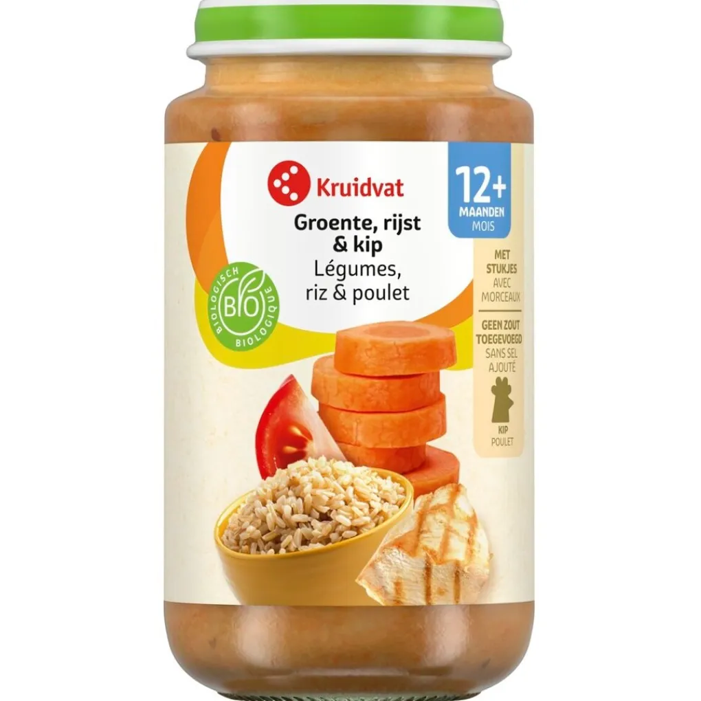 Laat je baby genieten van deze heerlijke Kruidvat 12+M Bio Groente, Rijst & Kip Maaltijd. De maaltijd is geschikt voor kindjes vanaf 12 maanden.