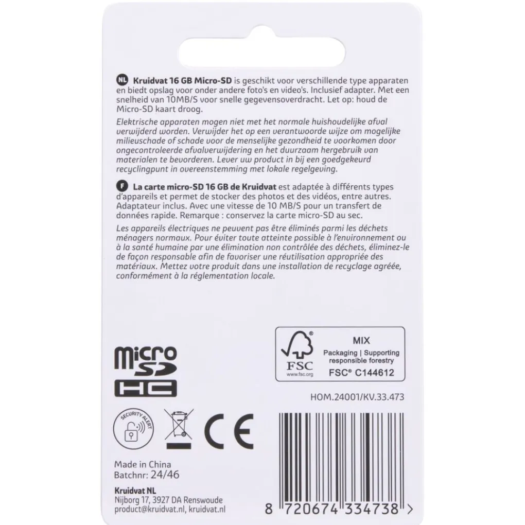 Deze Kruidvat 16GB Micro SD-kaart heeft 16 gigabyte opslagruimte voor het opslaan van foto’s en filmpjes. Dankzij de bijgeleverde adapter is deze micro SD-kaart geschikt voor verschillende apparaten.