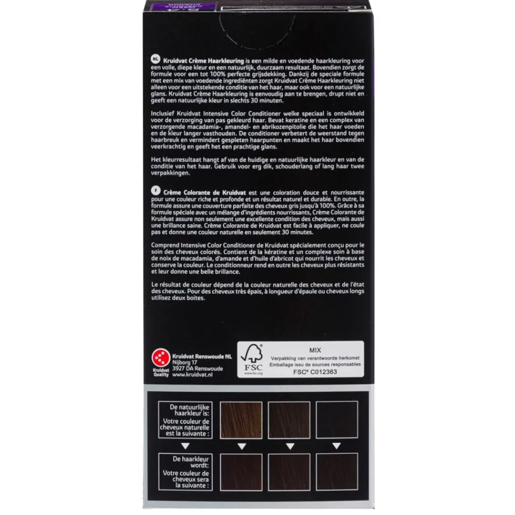 Het kleurresultaat hangt af van de huidige en natuurlijke haarkleur en van de conditie van je haar. Kruidvat Crème Haarkleuring is ontwikkeld en getest in samenwerking met kappers.