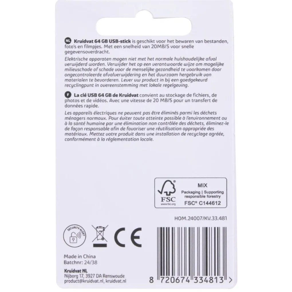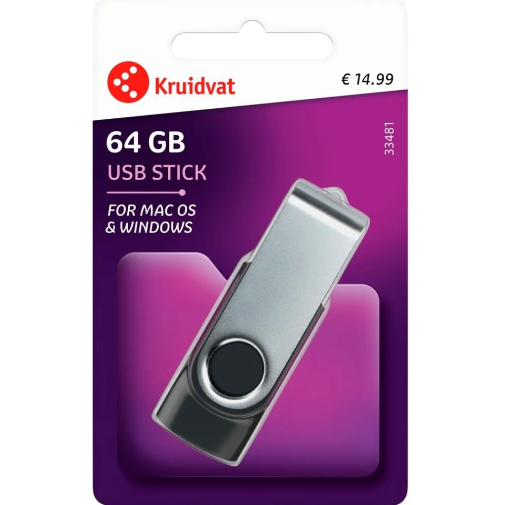 Bewaar bestanden, foto’s en filmpjes op deze Kruidvat 64GB USB-stick. De compacte USB-stick heeft een opslagcapaciteit van 64 gigabyte en een snelheid van 20 MB/S.